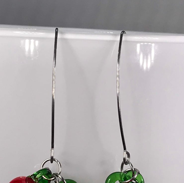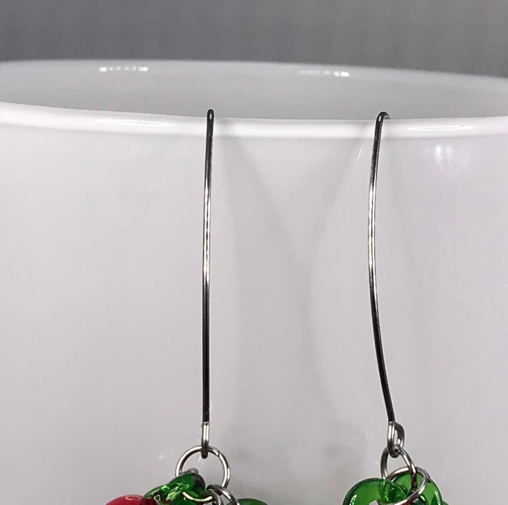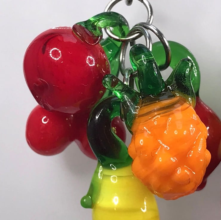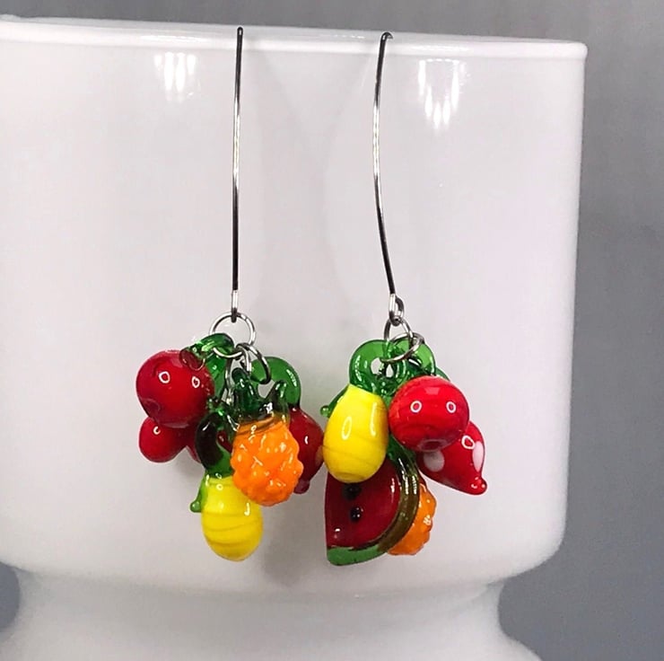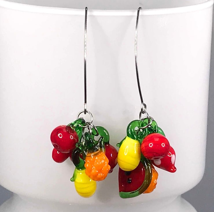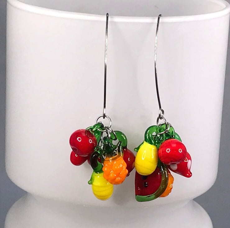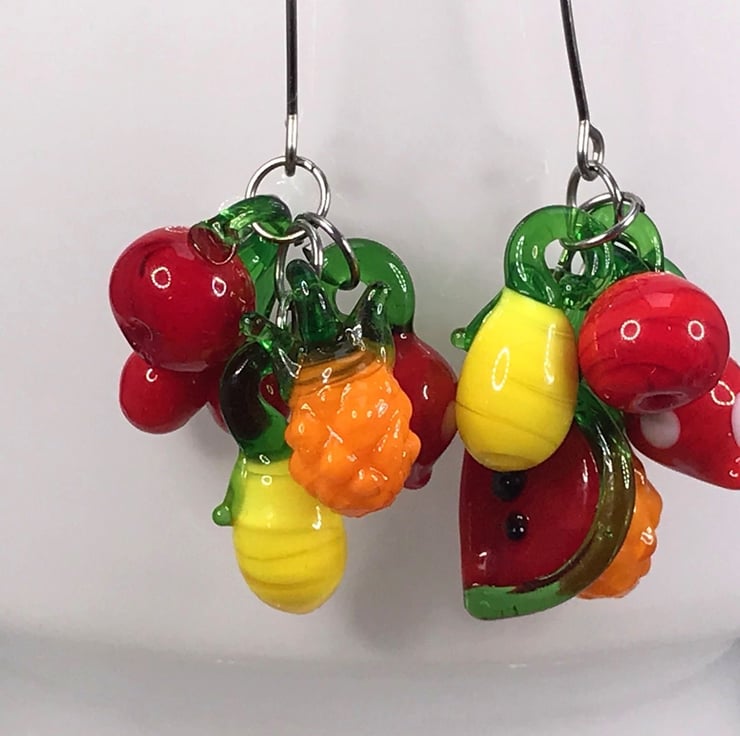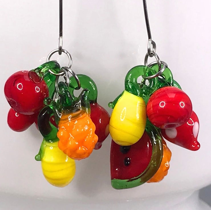 These are lampwork glass fruit bunches stacked on two fairly long and brilliant stainless steel threader ear wires. I love the threaders, they give the earrings a bit of edge. Punk Carmen Miranda!