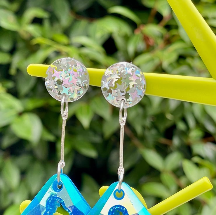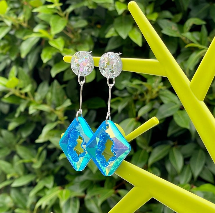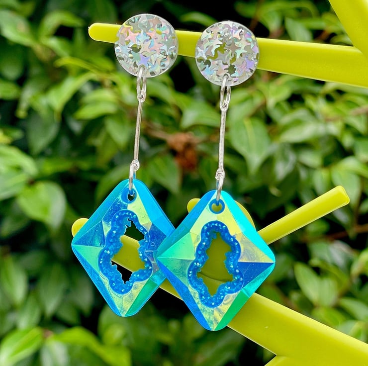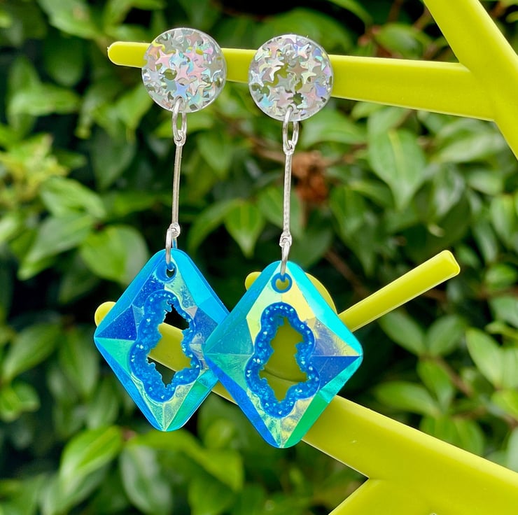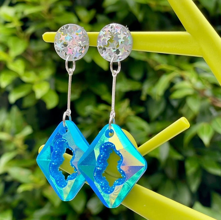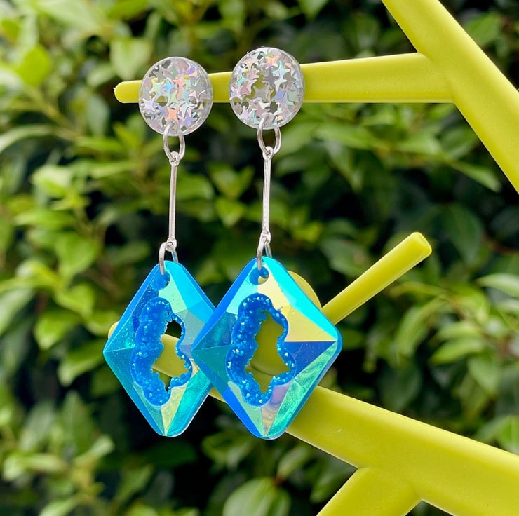 I've used rectangular blue resin geode faux druzy pieces and paired them with holographic star glitter silver pushback resin posts.