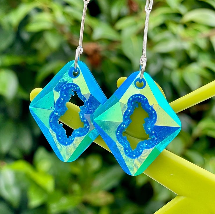 Oh these are stunning! Blue resin geode earrings with a funky holographic pattern.