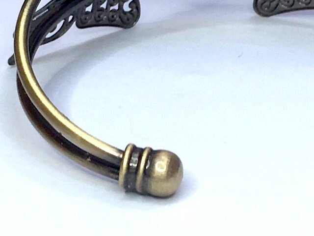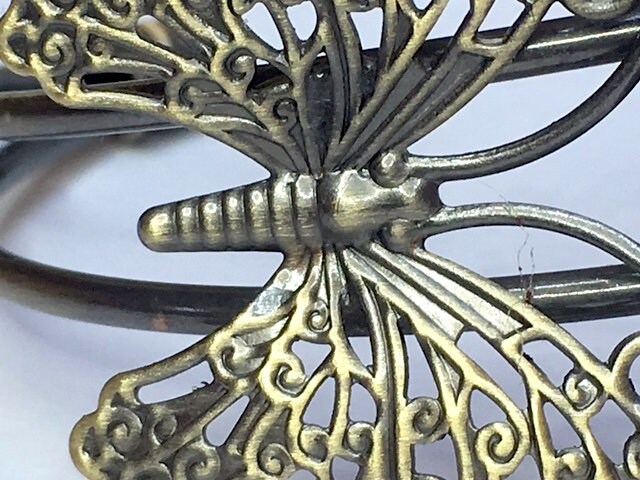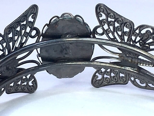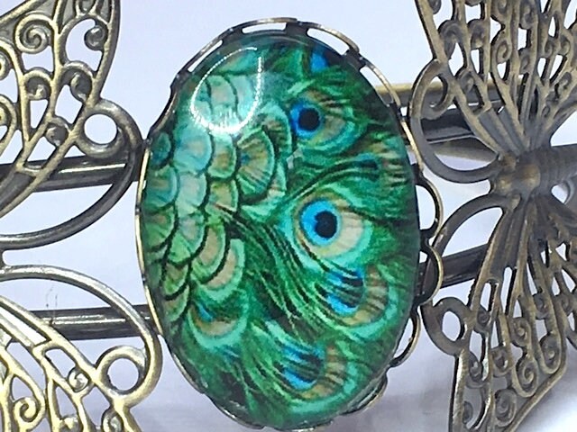It's in antique bronze with two large butterflies attached. Very Art Nouveau. I've added a little glass cabochon to this one, 18 x 25 mm green peacock feathers. Lovely.