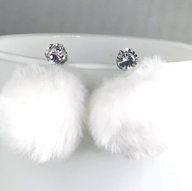 I've used large white pompoms and matched them with silver plated crystal stud back connectors. The pompom measures 4.5 cm and the whole thing is 5.5 including the crystal stud.