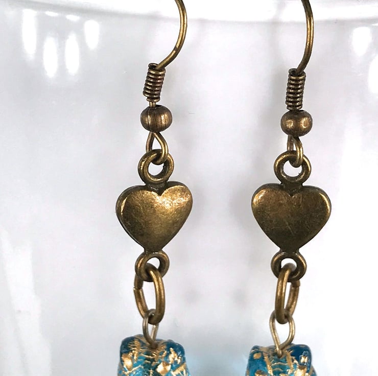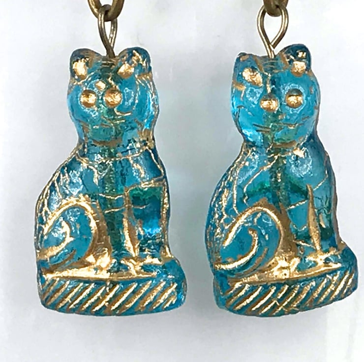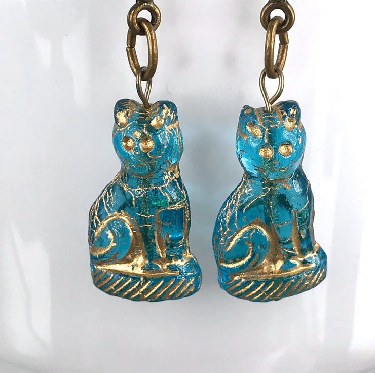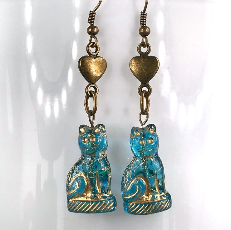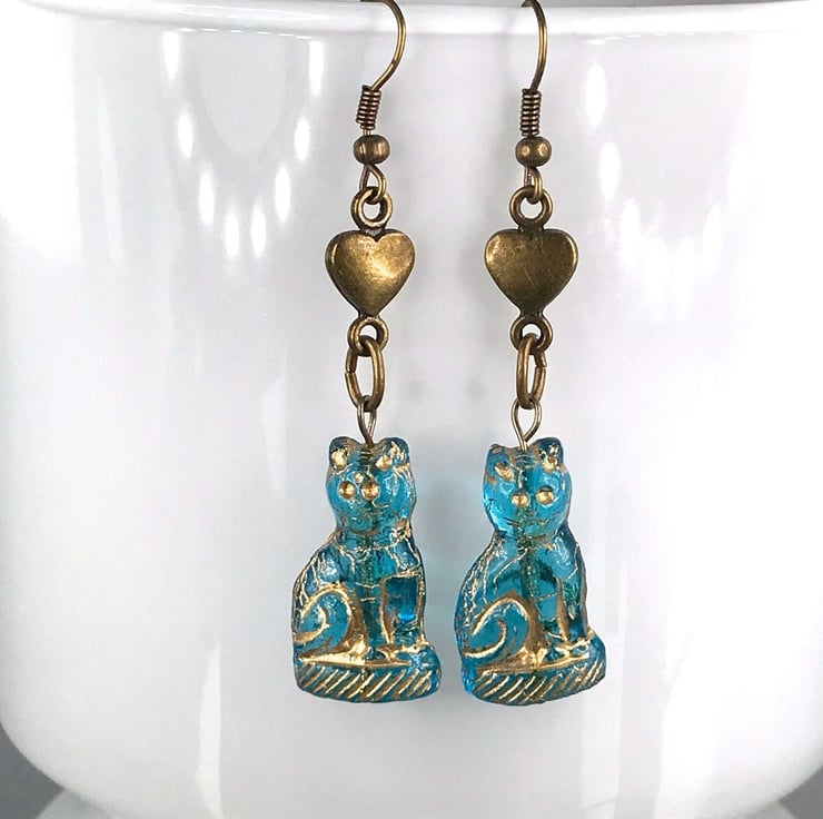 Ah these are so beautiful. I love them. Little turquoise blue Czech glass cats and bronze heart earrings. I think the colours go beautifully together. So gorgeous and just a tiny bit retro.