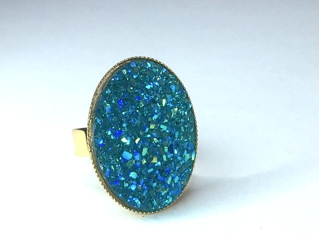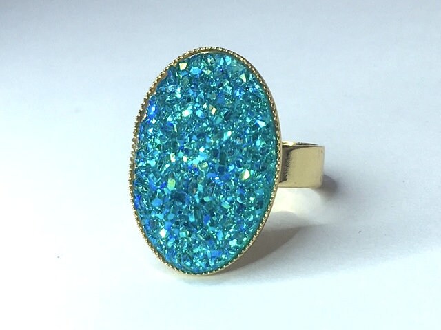 AQUAMARINE DRUZY RING faux druzy gold plated fits all sizes glitter disco oval