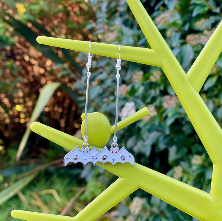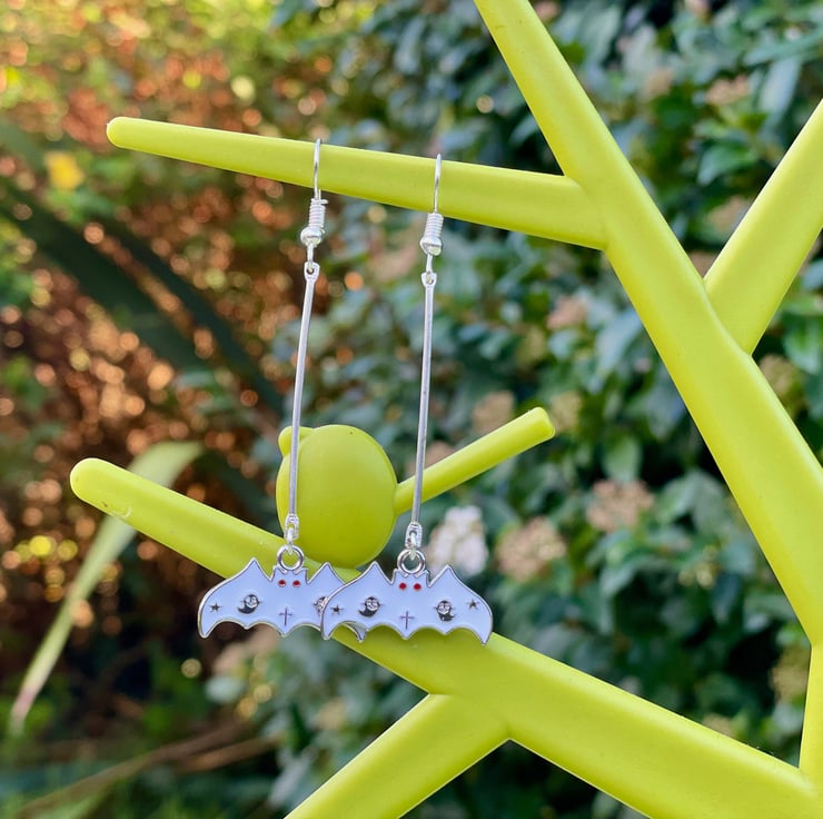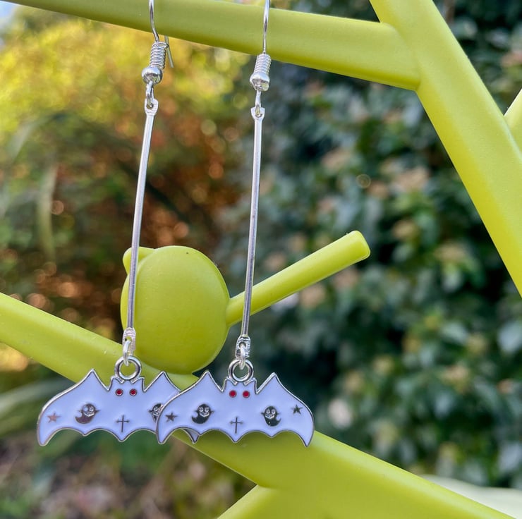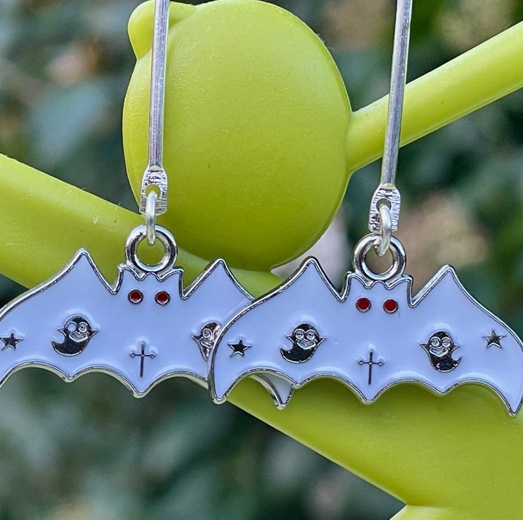 I've used two white bat charms in lovely enamel on silver plated brass and paired them with a lovely silver plated long bar connector and hypo allergenic silver plated stainless steel ear wires for strength.