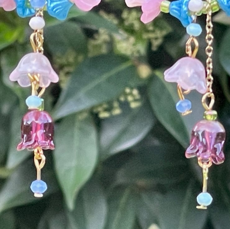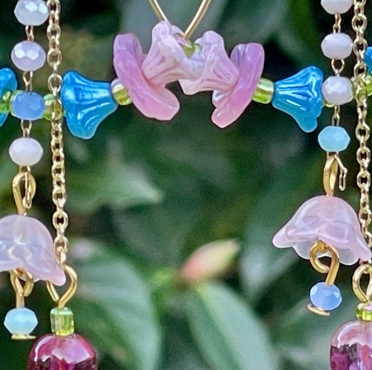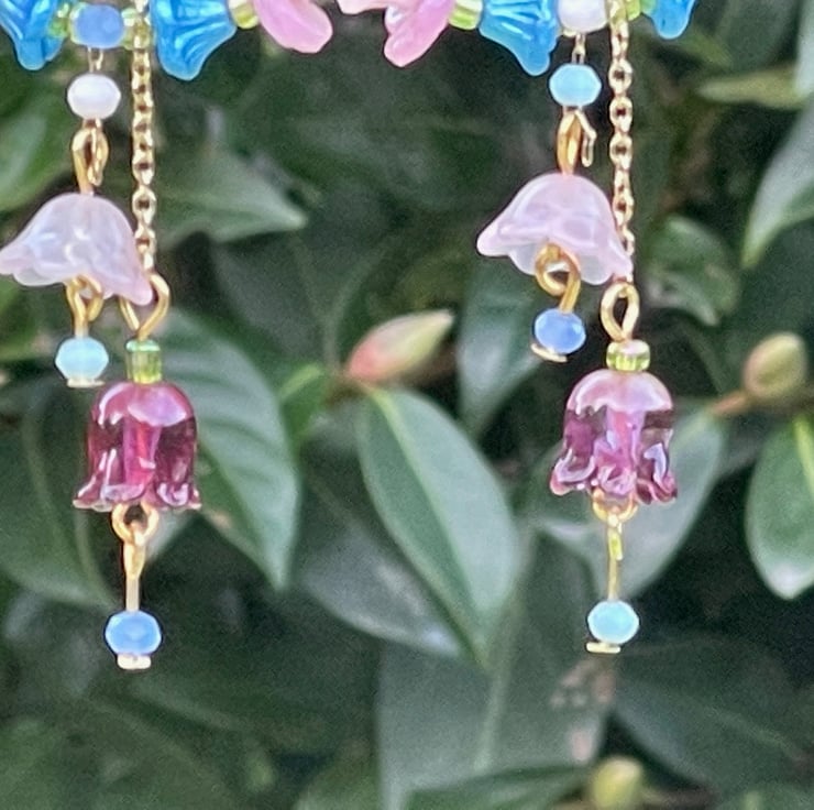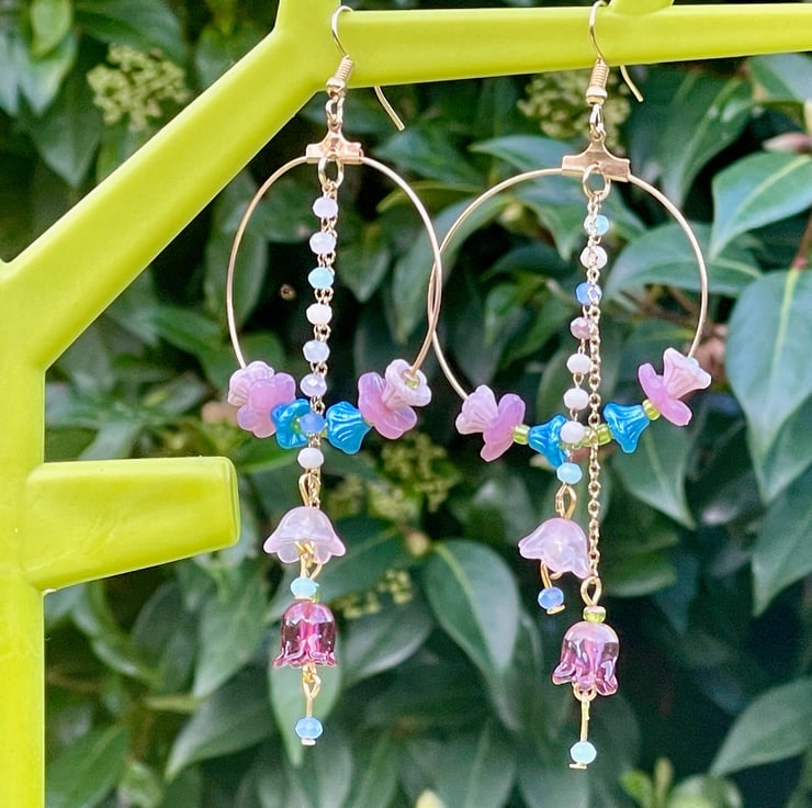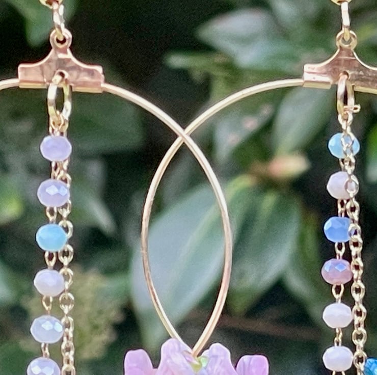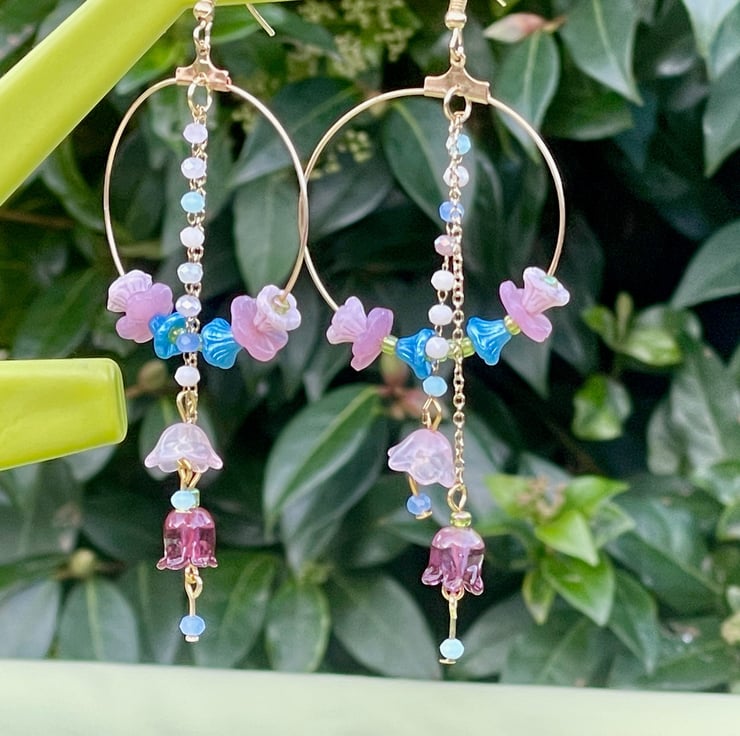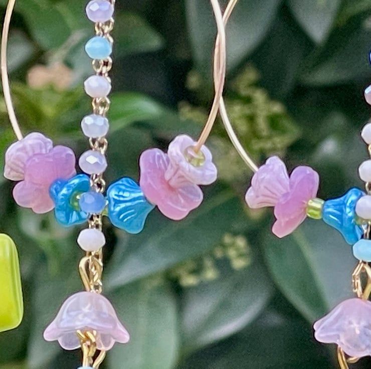 I've used gold creole hoops and paired them with crystal drop chains in pastel colours, Czech glass flowers in trumpet and flat shapes in various shades of pink and blue and finished off with toho japanese seed beads in green. I've then finished off the whole earring with gold plated hypo allergenic ear wires.