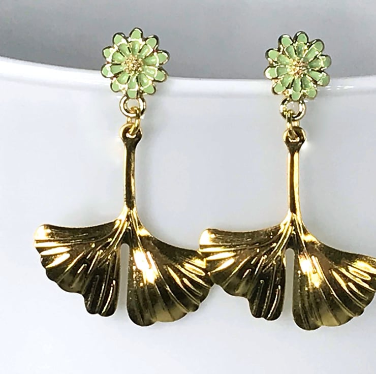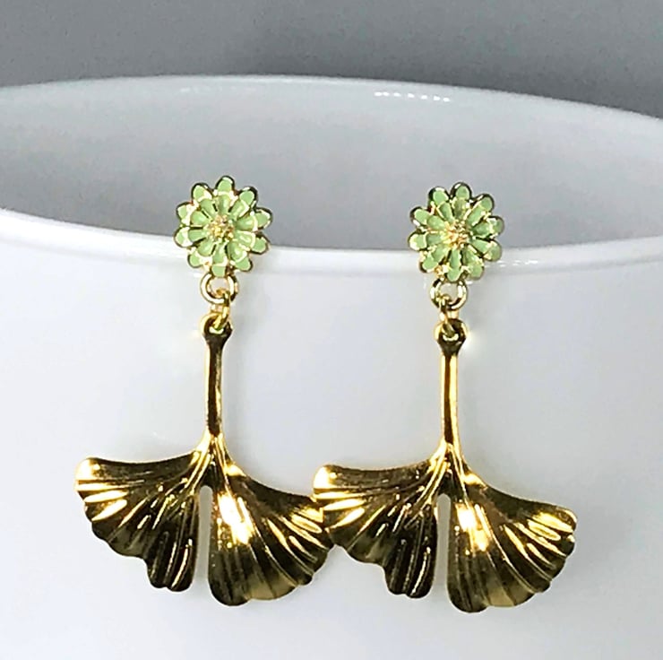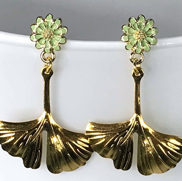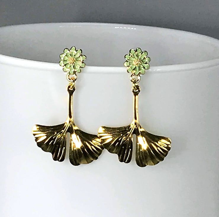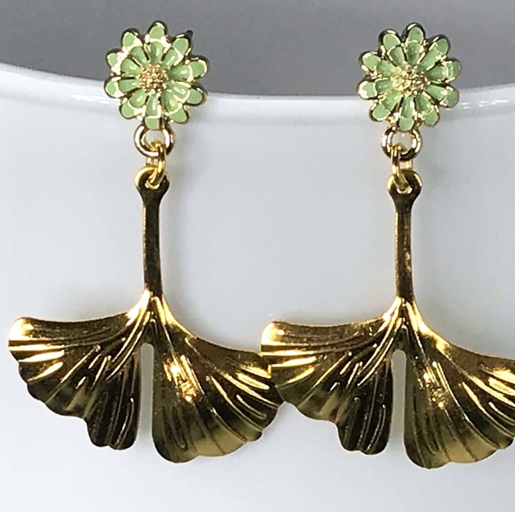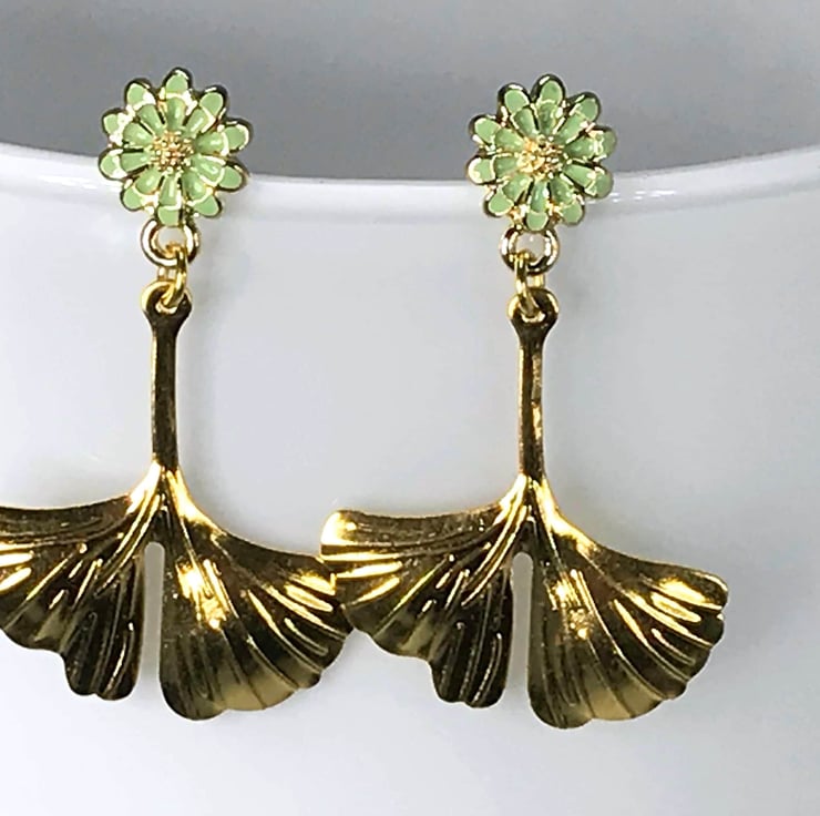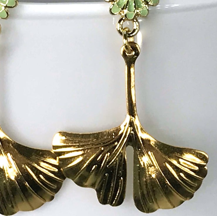 I've used fine brass slightly 3d ginko leaf charms and paired them with beautiful art nouveau style green enamel floral pushback studs also in gold plate on brass.