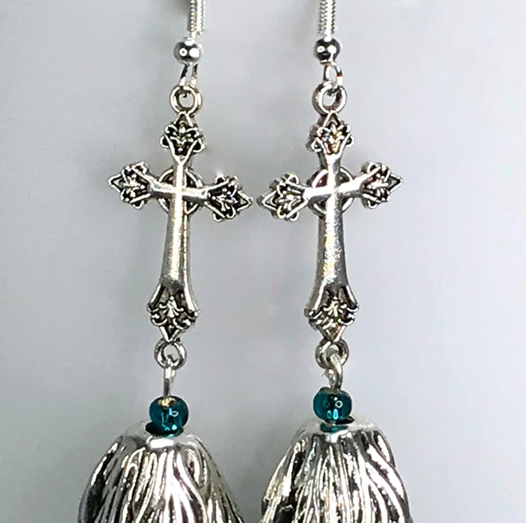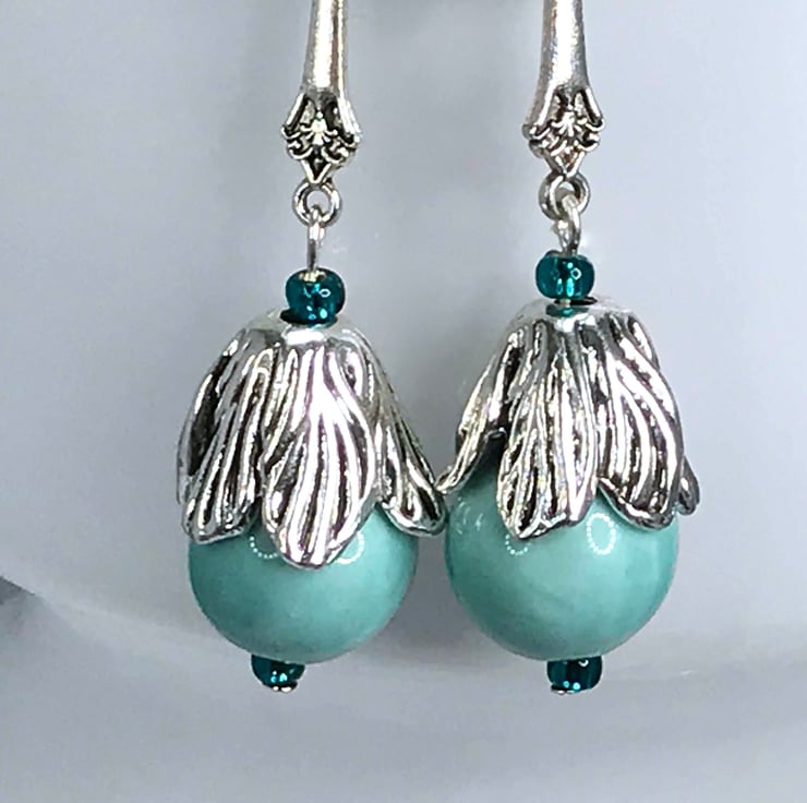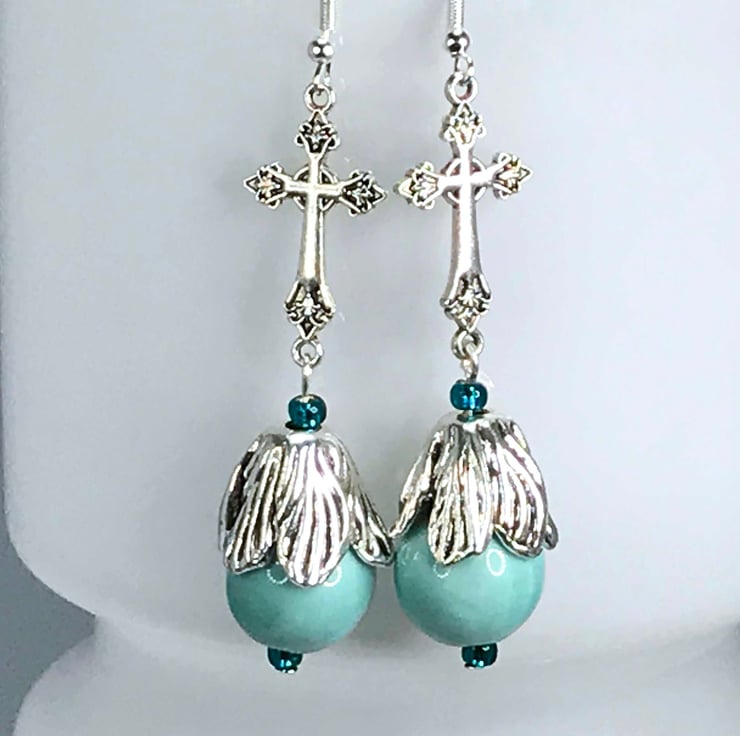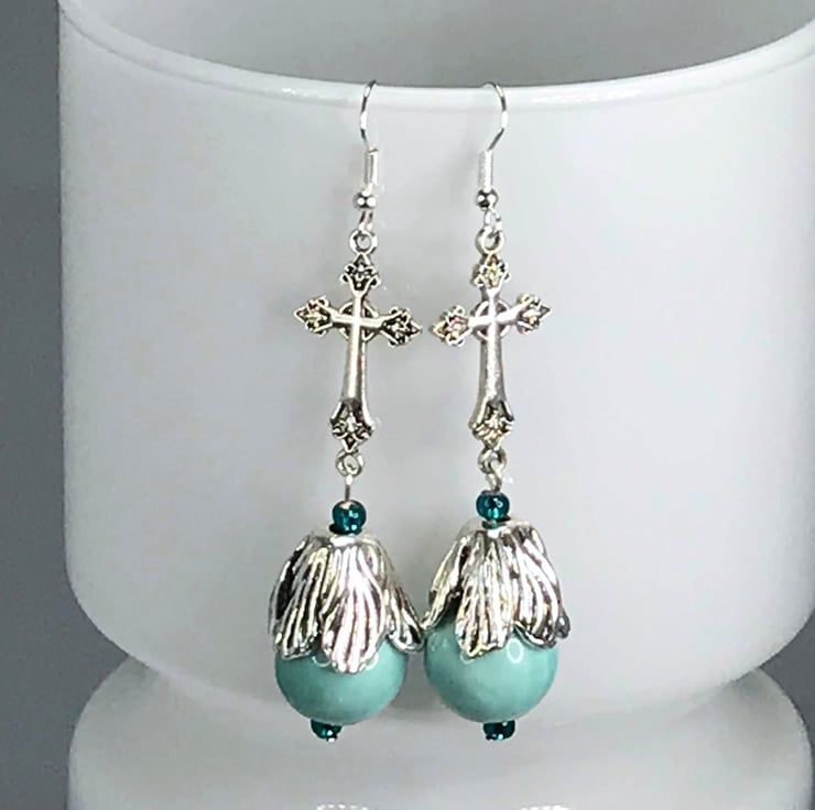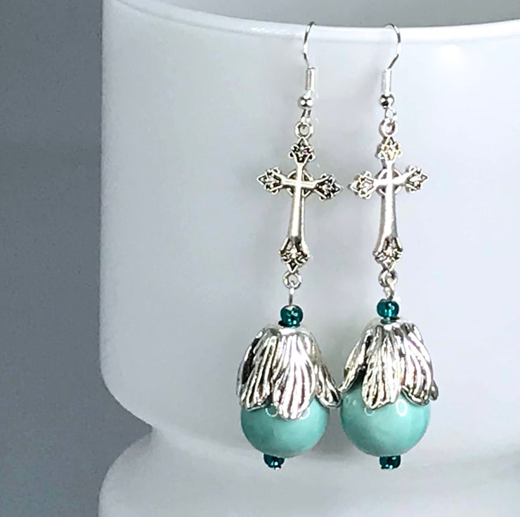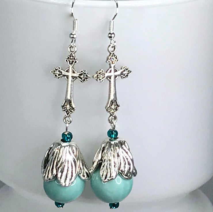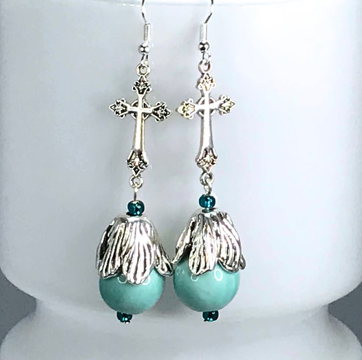 I've used lovely cross connectors in silver plated brass and paired them with duck egg blue ceramic beads topped with a beautiful silver plated flower bead cap. Really lovely.