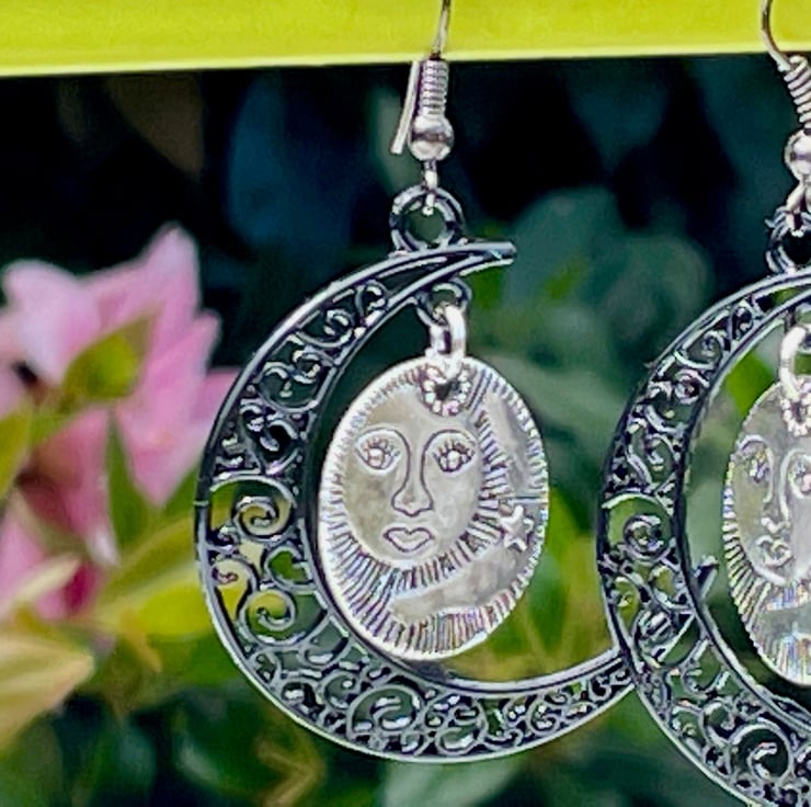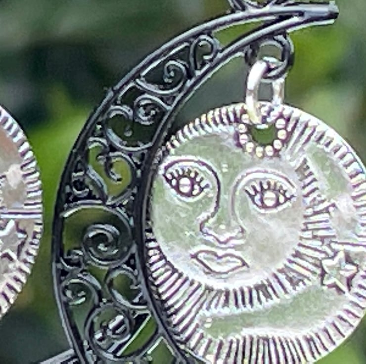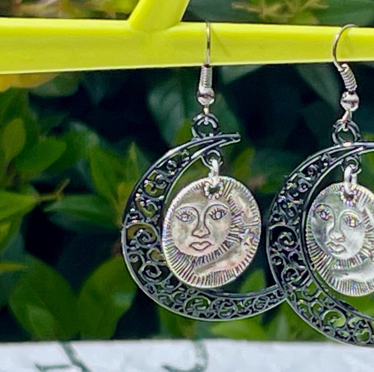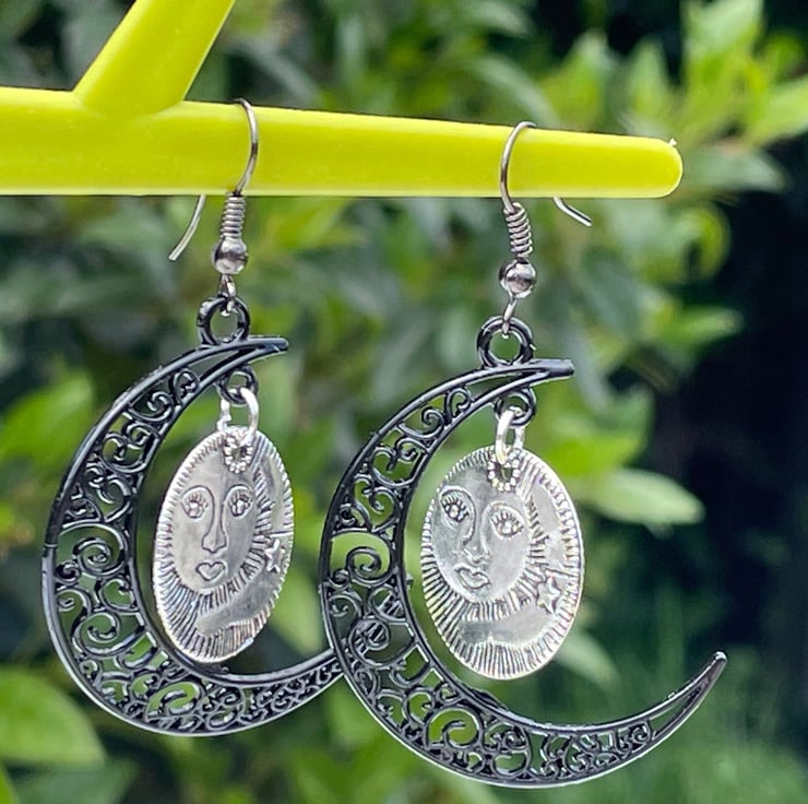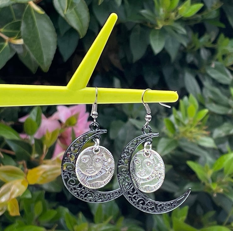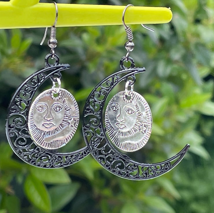 Moon and sun and star earrings in a gorgeous graphite moon with a gorgeous hanging sun and star silver plated charm.