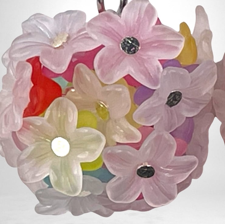 We've used lucite acrylic flowers in two sizes and some lovely rainbow colours. We've added them in a cluster to a stainless steel ring creating a 3D ball shape. WE KNOW! A BALL! We've added a chain in several sizes to set them off.