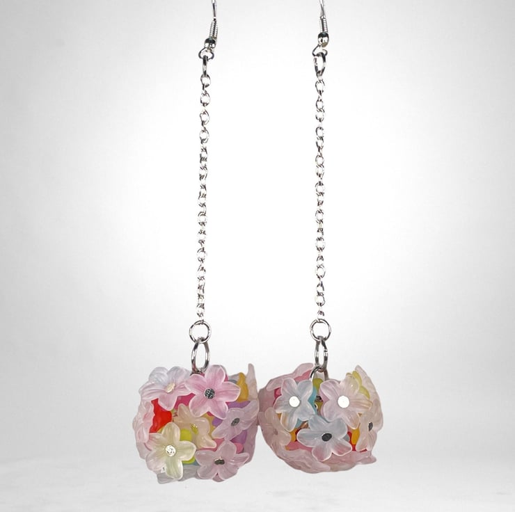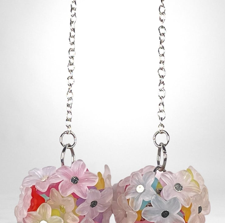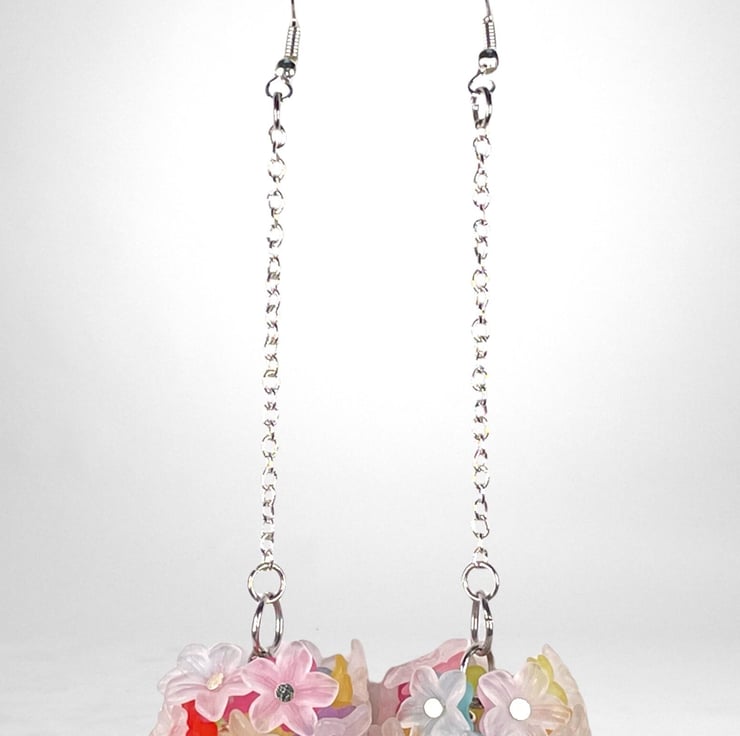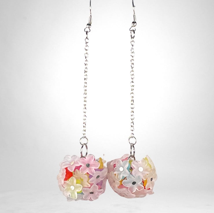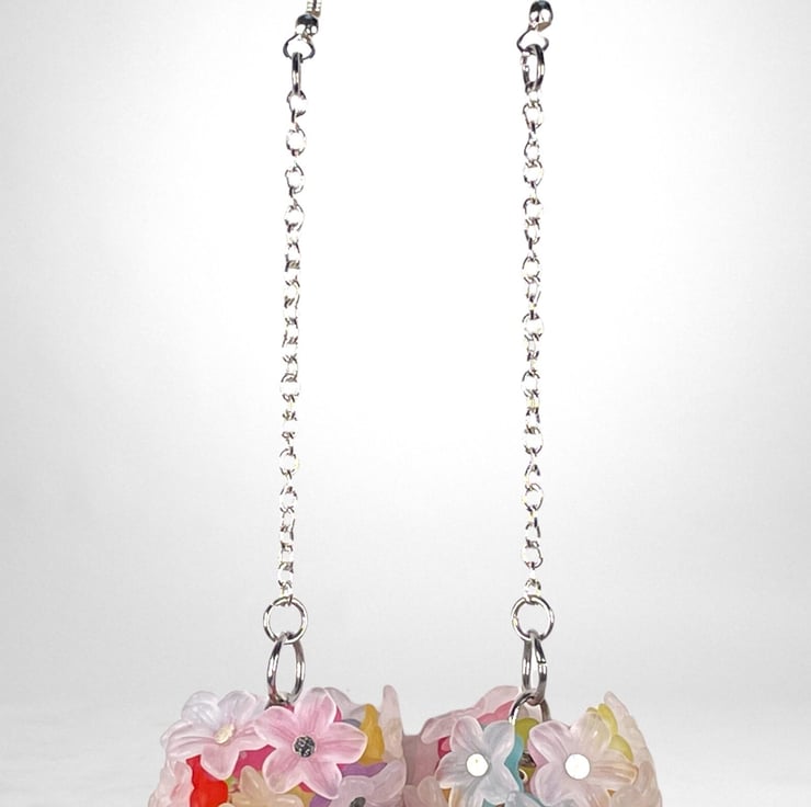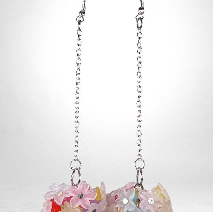 Acrylic lucite flower blossom bomb earrings in gorgeous muted rainbow colours paired with a drop silver plated chain and ear wires bright silver plated brass. Yum.