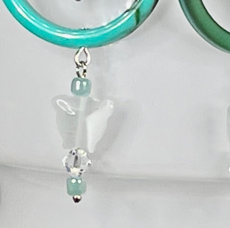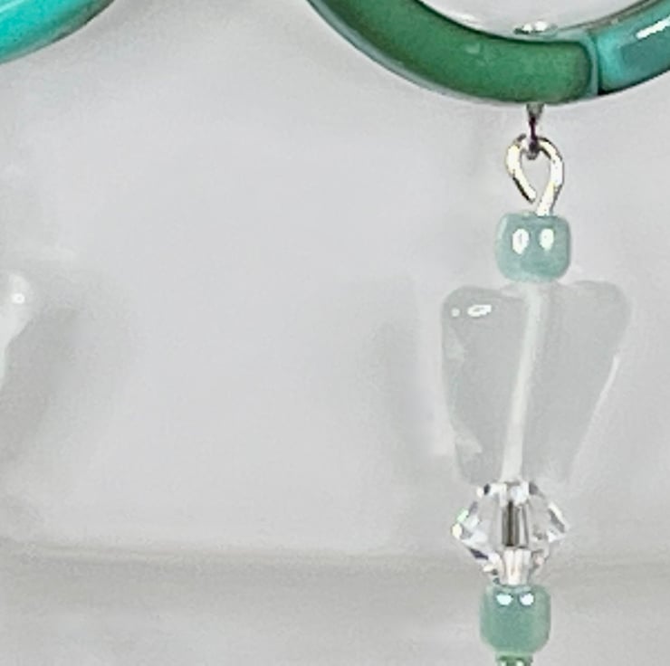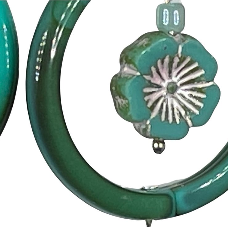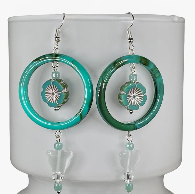 I've used drilled resin hoops and paired them with gorgeous Preciosa Czech glass flowers in a matching colour. I've added cat's eye butterflies in white and finished off with Swarovski crystals, mint coloured Japanese Toho beads and silver plated hypo allergenic ear wires.