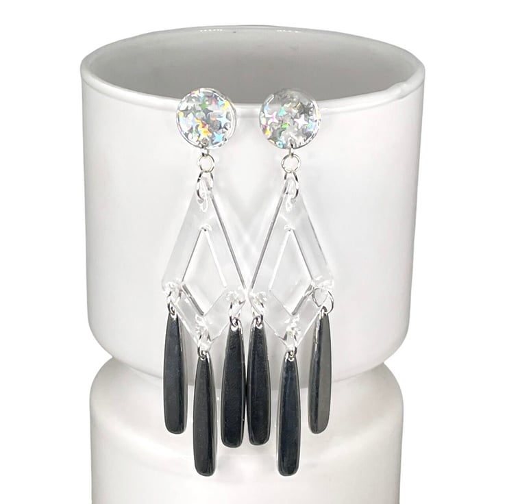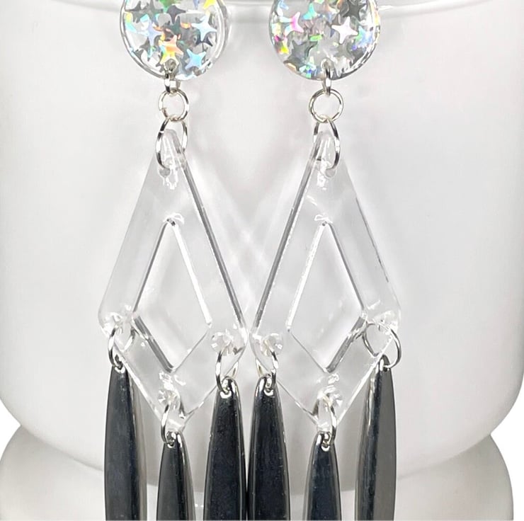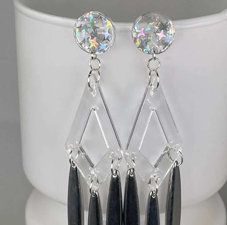 Clear acrylic chandelier earrings with chrome drops and star glitter holographic posts!
