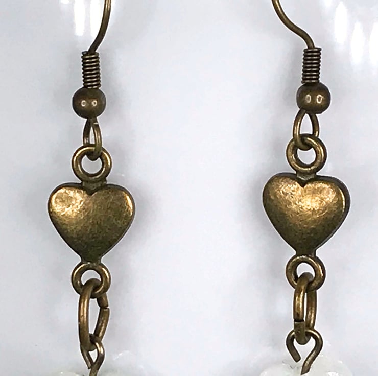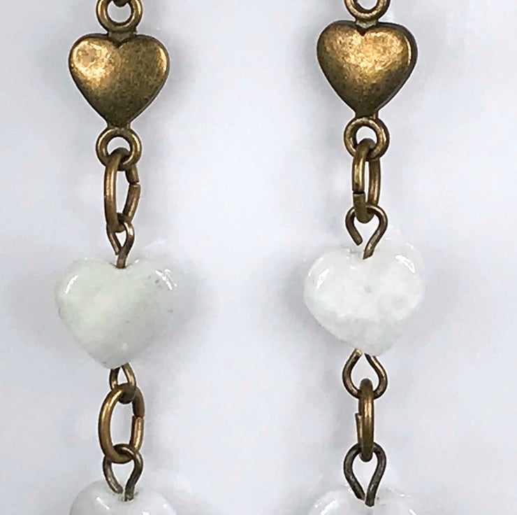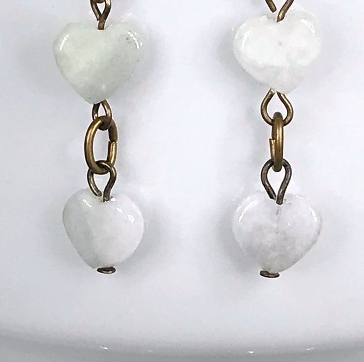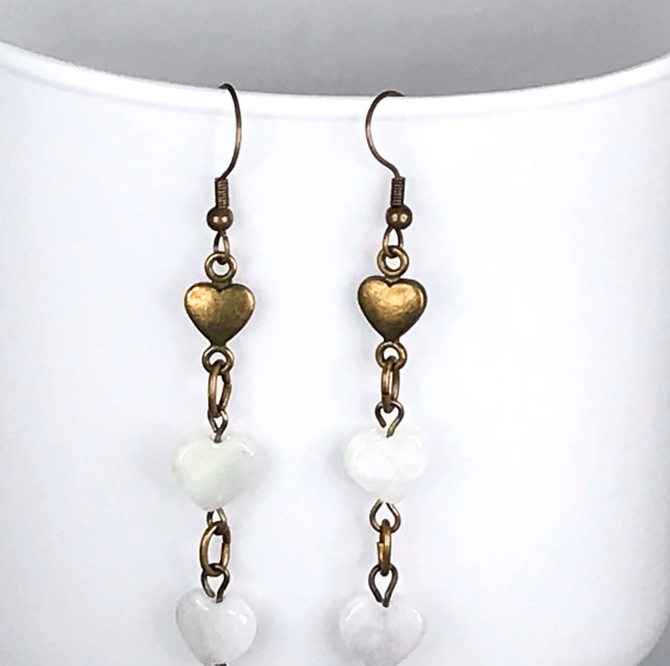 I've used the cutest light green jade hearts and paired them with bronze heart connectors, bronze oval jump rings and bronze ear wires.