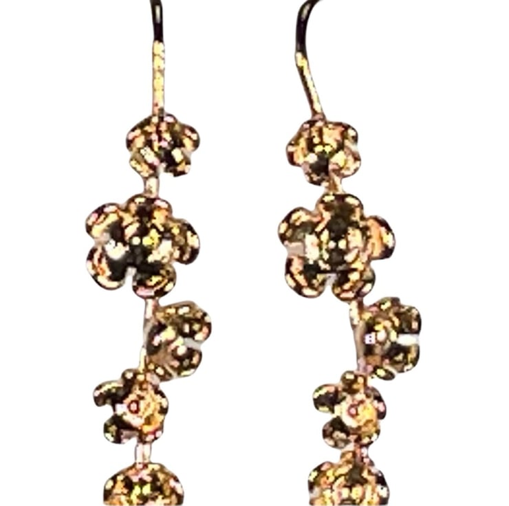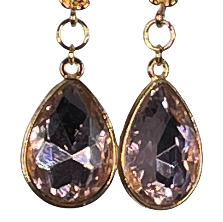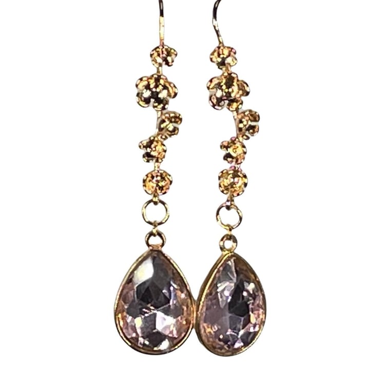 I've used a stunning teardrop shaped crystal in a stunning lilac pink colour and paired it with a ear wire studded with tiny peach blossom flowers in champagne gold.