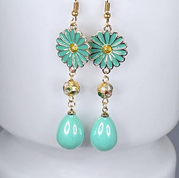 I've used blue enamel daisy connectors and paired them with beautiful 6 mm gold cloisonne beads and finished off with a very delicate blue lustre teardrop charm and antique gold plated ear wires.