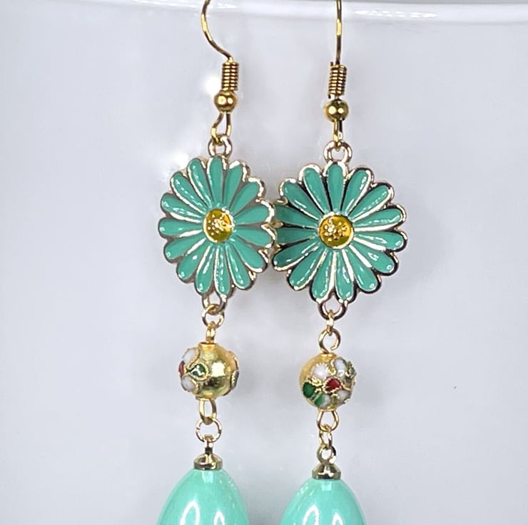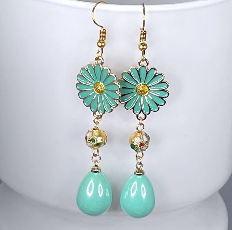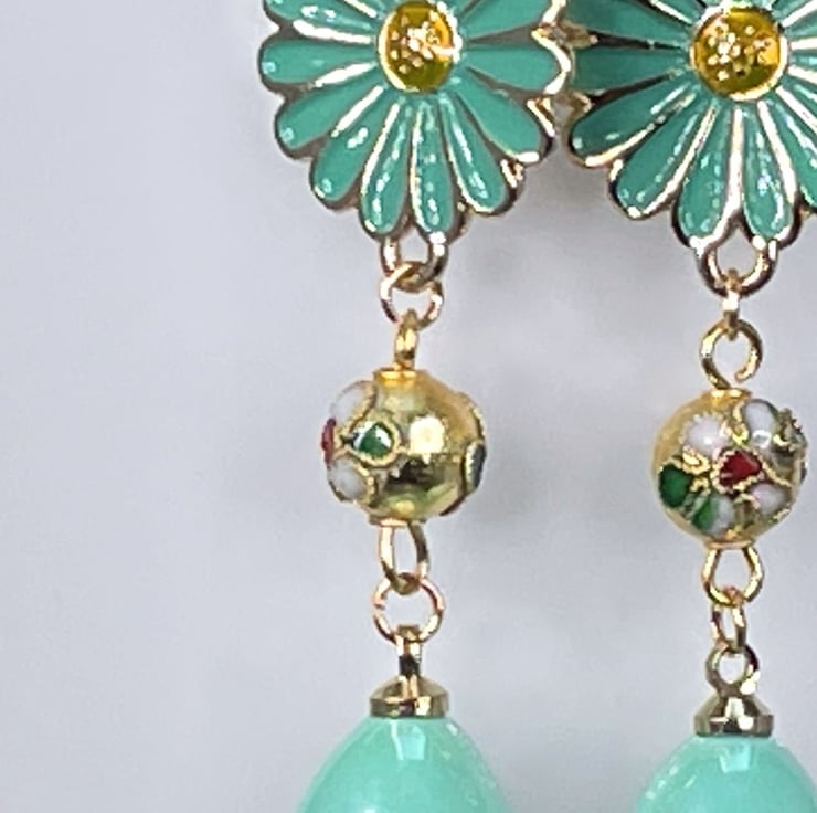 I fell in love with these cloisonne beads and wanted to work with them. So far I've made three pairs or earrings with them. Maybe four. This was the first one. i also ADORE these little blue daisy connectors. So sweet.