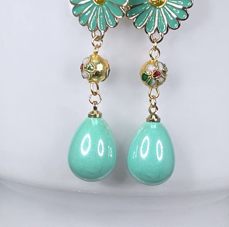 I've used blue enamel daisy connectors and paired them with beautiful 6 mm gold cloisonne beads and finished off with a very delicate blue lustre teardrop charm and antique gold plated ear wires.