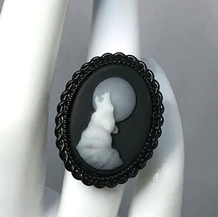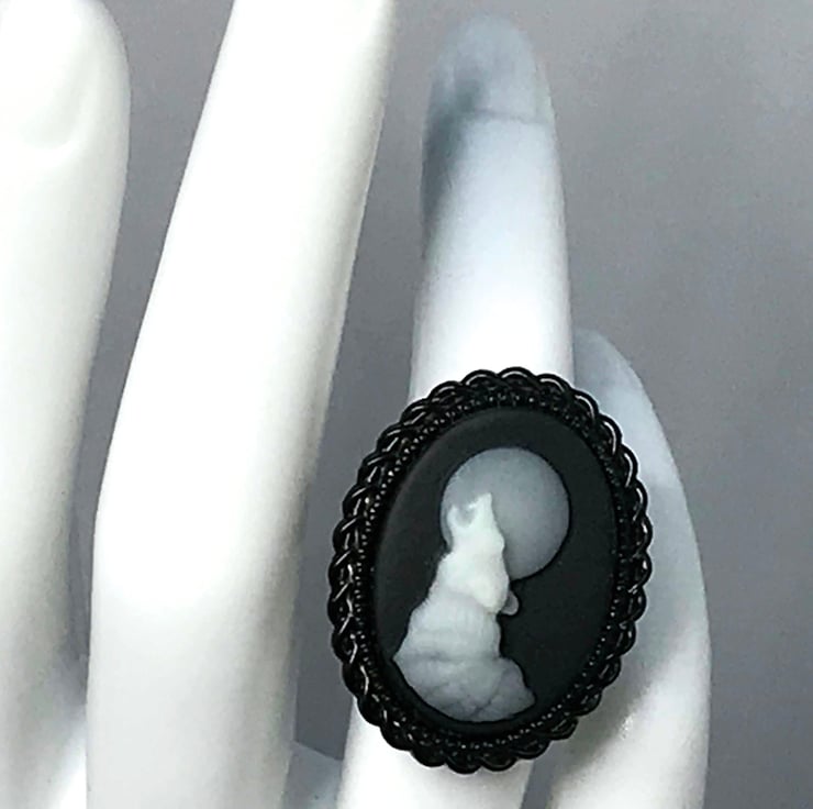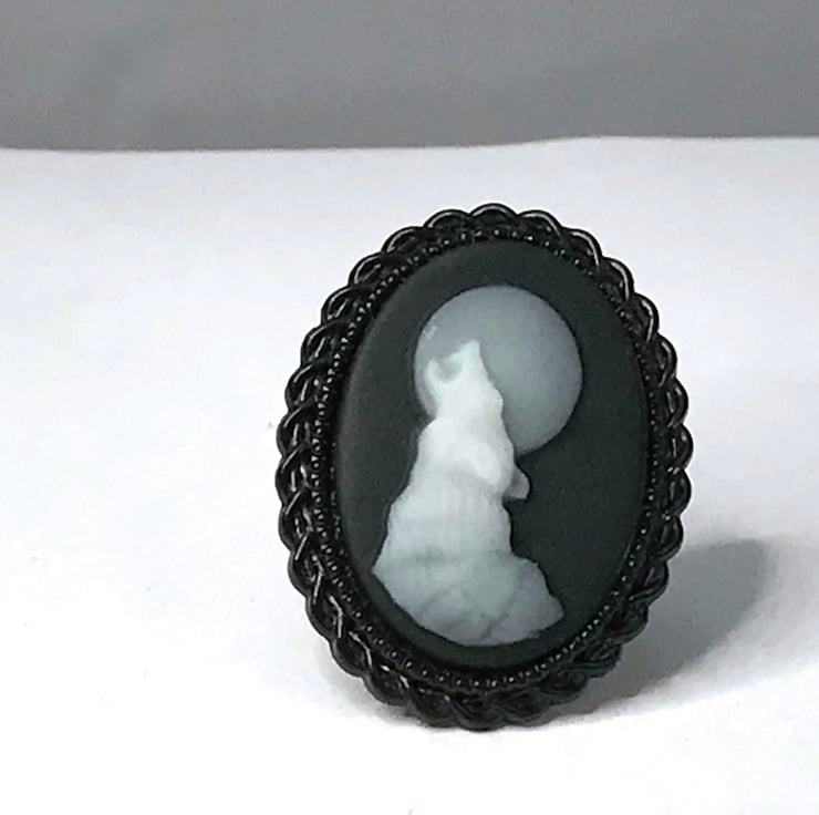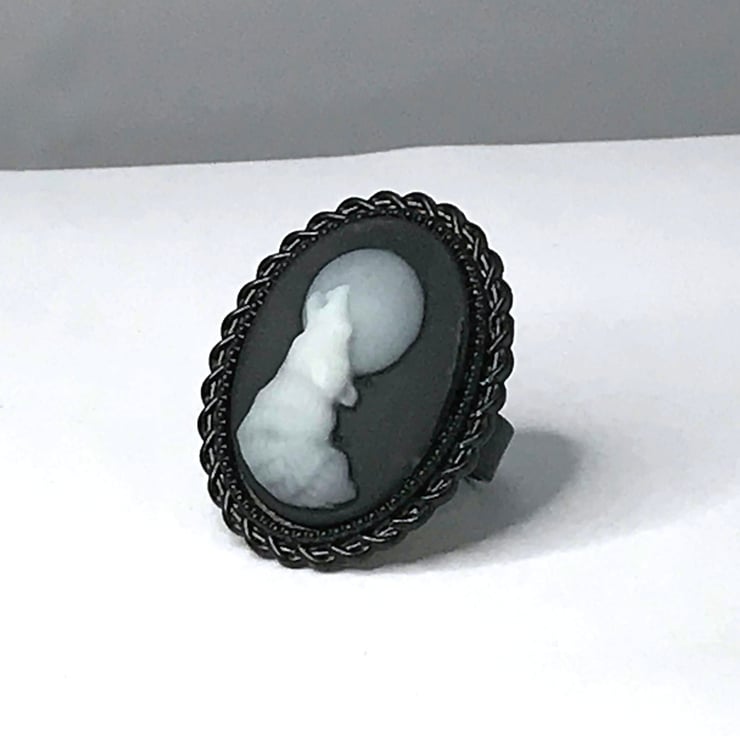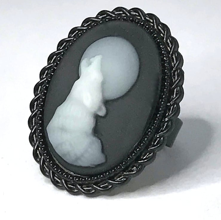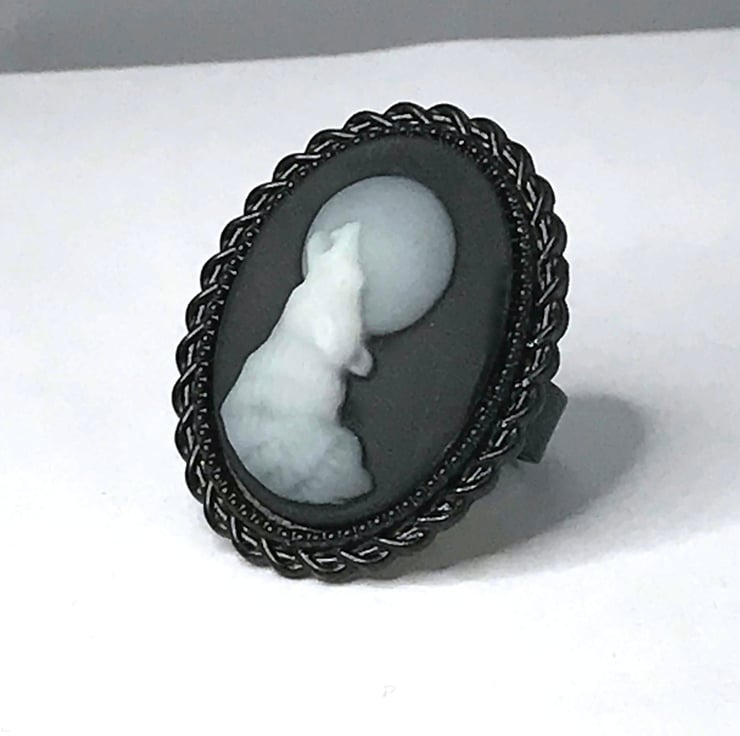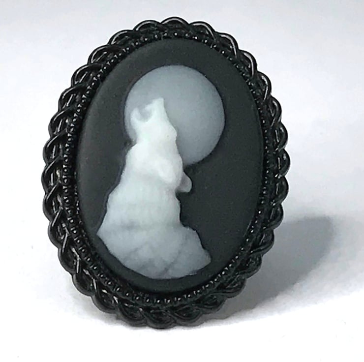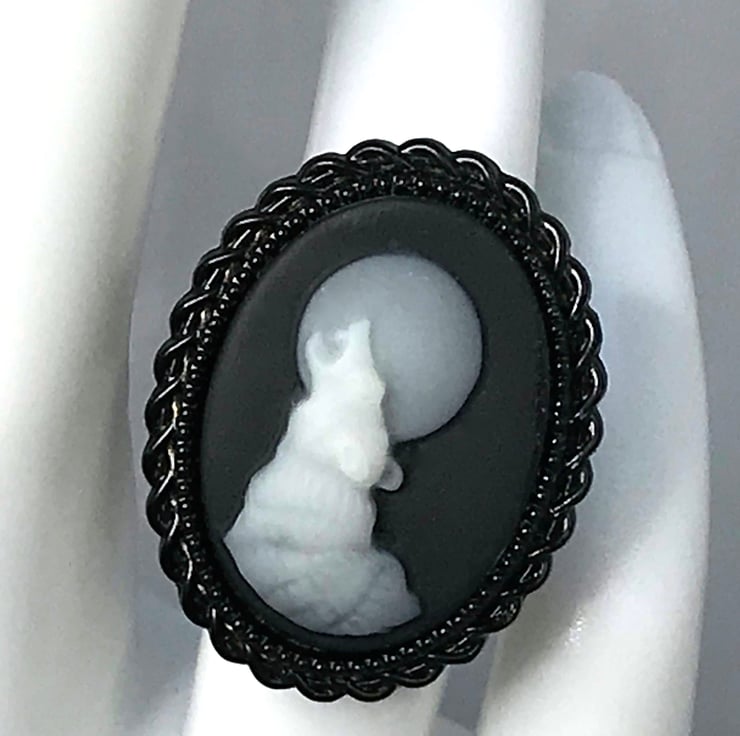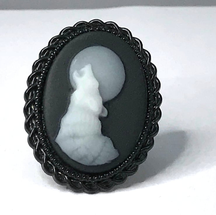 This is one of my favourite things. A resin wolf ring in a cameo style with a gorgeous gothic stylised ring base to match.