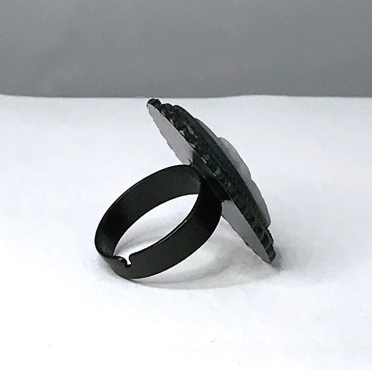 I've used a resin cameo wolf cabochon in black and opaque white resin and added it to a lovely filigree graphite ring base.