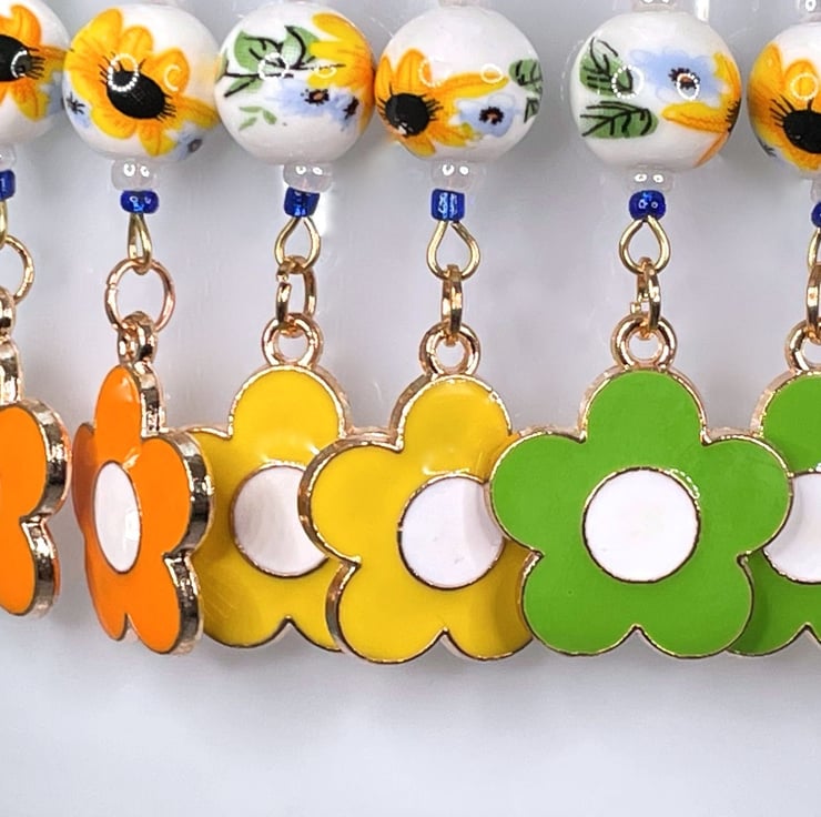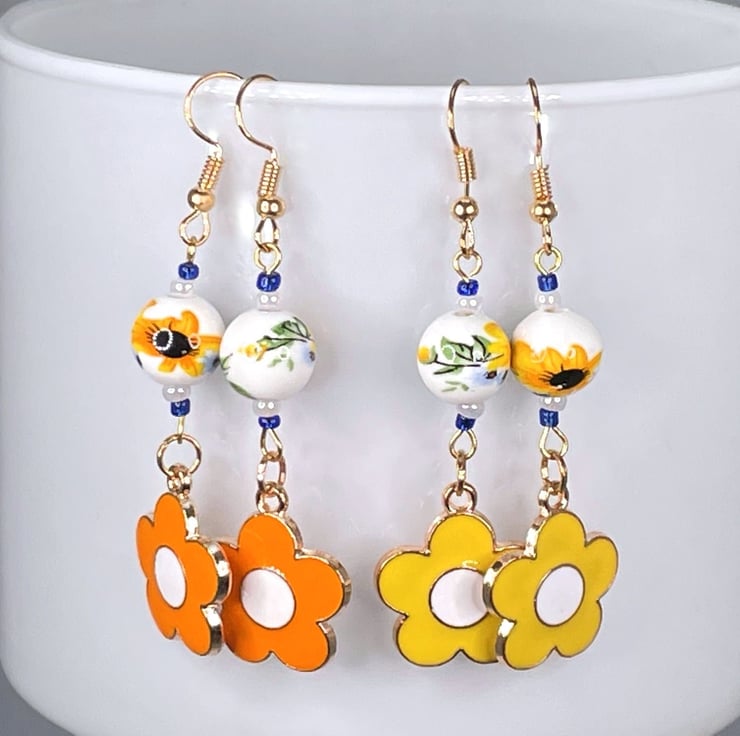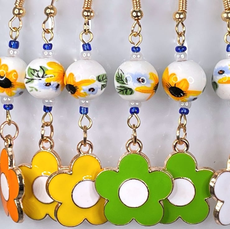 I've used retro flower charms in various colours of enamel on gold plated brass and paired them with gorgeous 8mm ceramic flower beads. I've used navy blue and lustre white Japanese Toho beads to pop out the colours in the beads and I've finished off with gold plated brass ear wires.