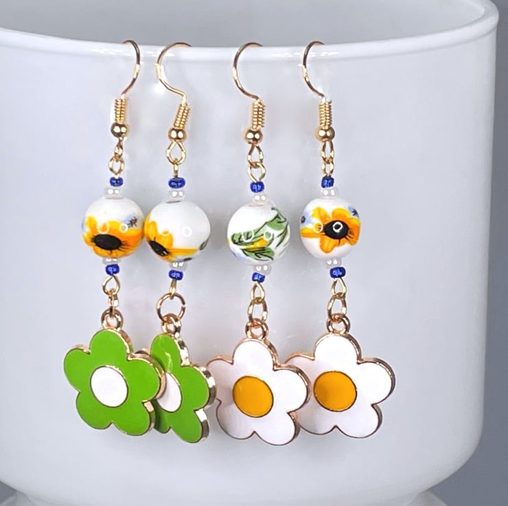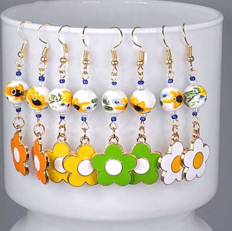 The flower charm measures 2 cm and the whole earring is 6.5 cm including the ear wire.