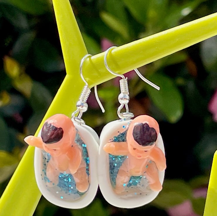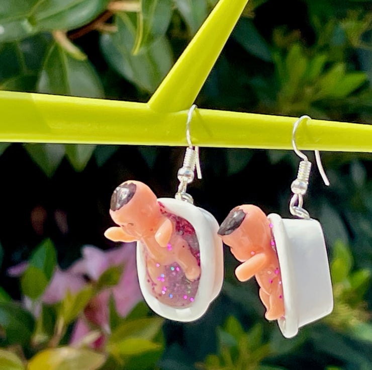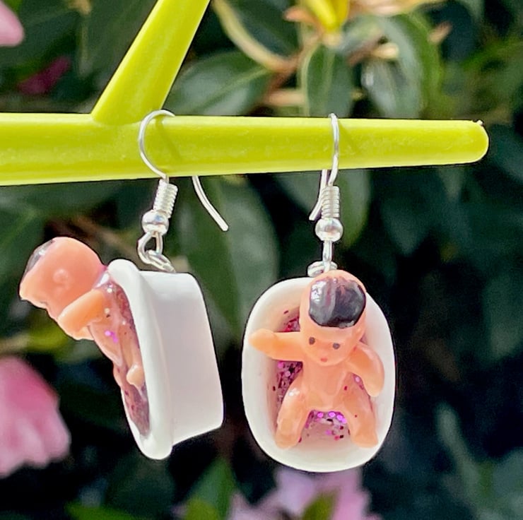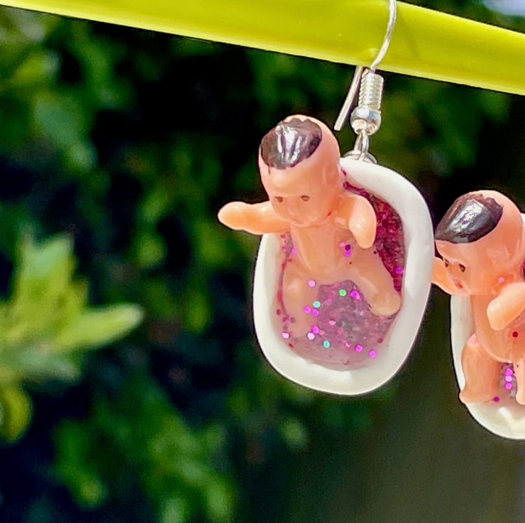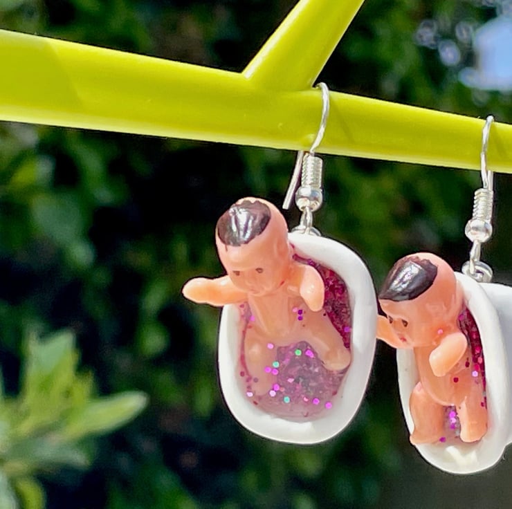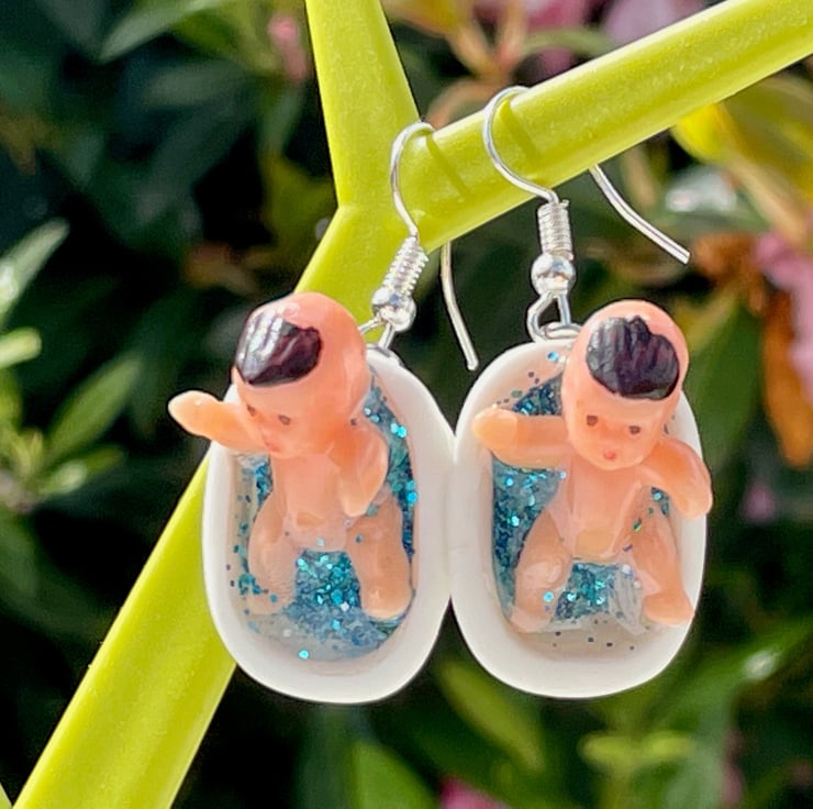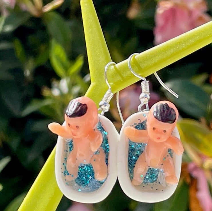 I've used cute little dollhouse miniature bathtubs in white resin with the sweetest little miniature dolls and glitter pink and blue resin for each. I've finished off with stainless steel hooks and hypo allergenic ear wires in silver plate.