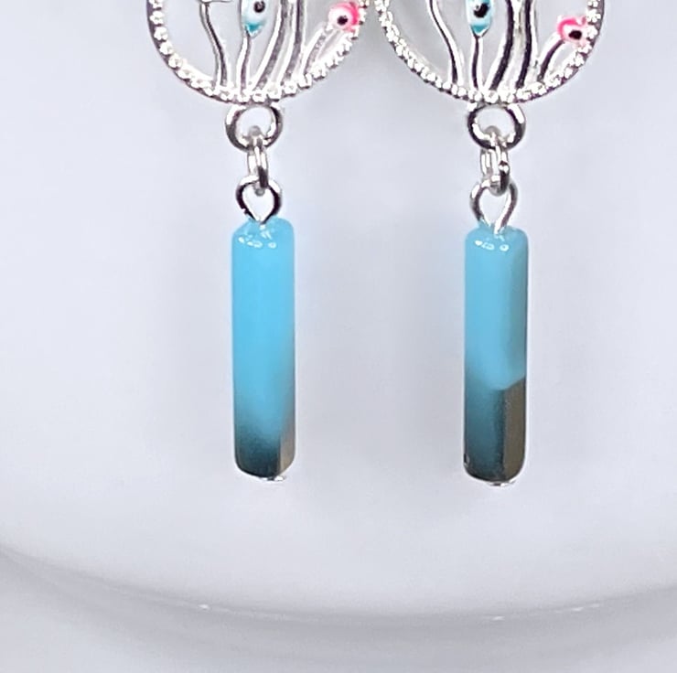 I've used lovely floral charms with the eye in the flowers, so cute. I've paired them with beautiful Czech glass electroplate on blue glass columns. I love a bit of Czech glass. It's always so groovy. I've paired the lot with silver plated ear wires on brass and stainless steel jump rings for strength.