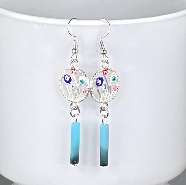 Czech glass earrings electroplate silver plated flower evil eye protective