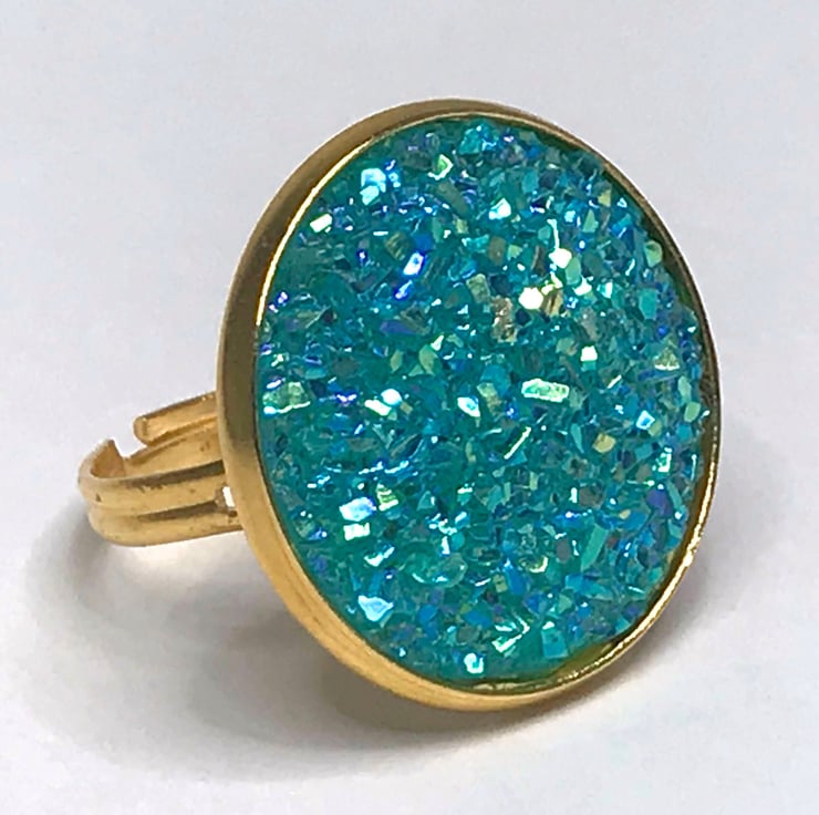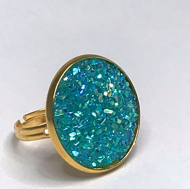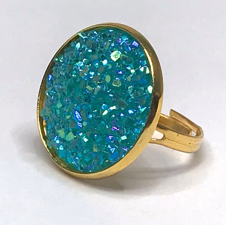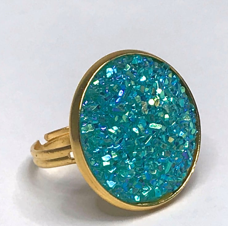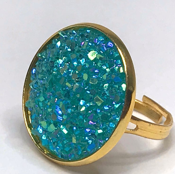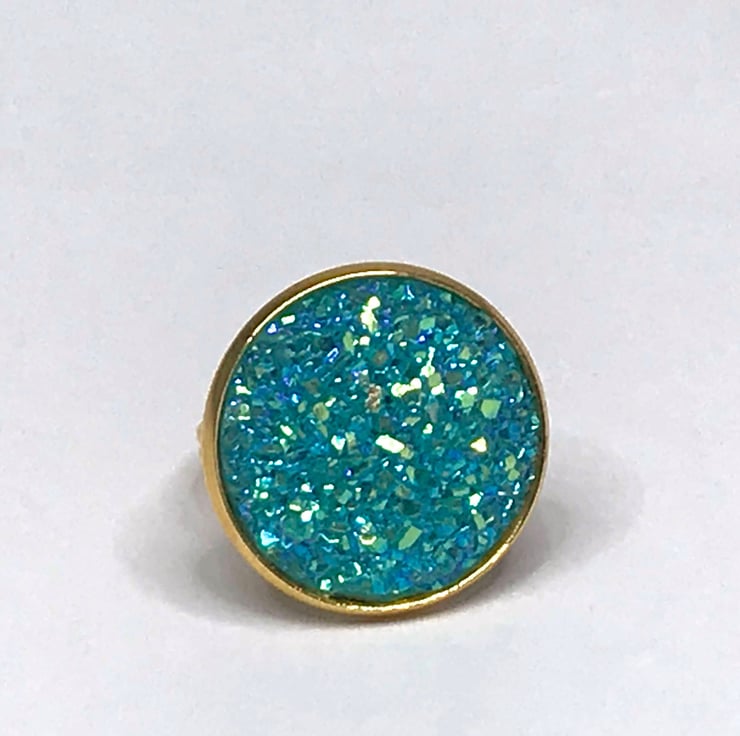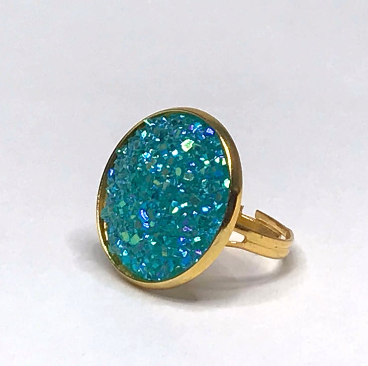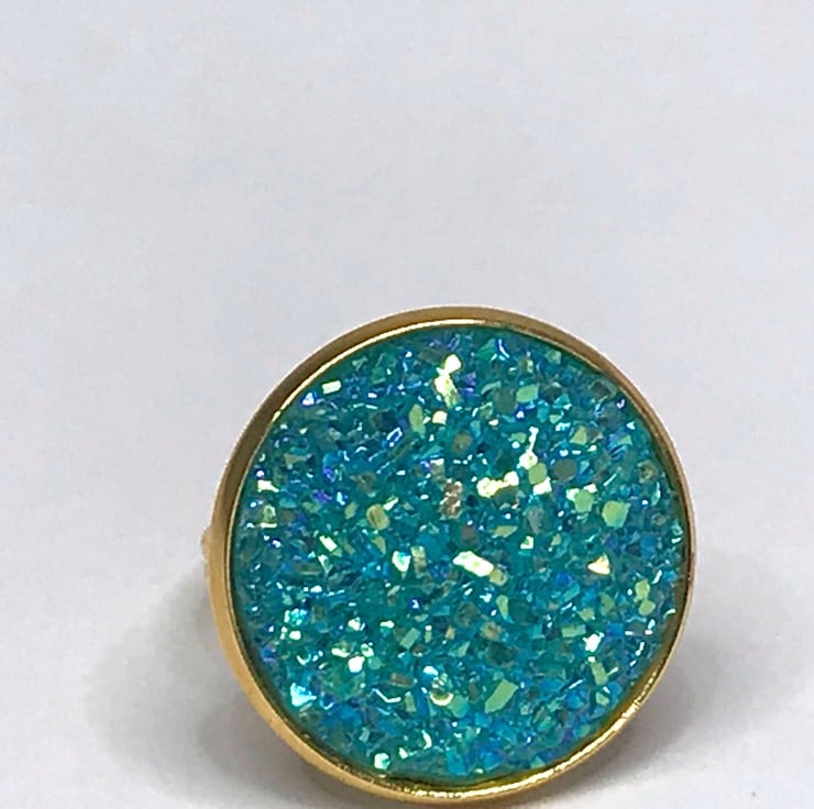 AQUAMARINE GLITTER RING gold plated adjustable 20 mm faux druzy