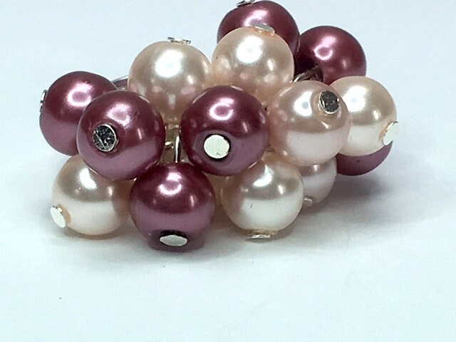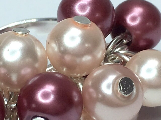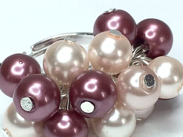 The ring is silver plated brass and adjustable and the pearls come in beautiful dark rose pink and blush. The beads are 6cm.
