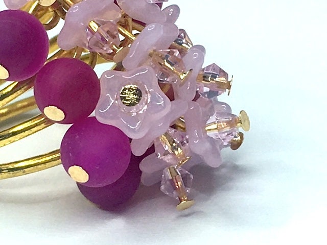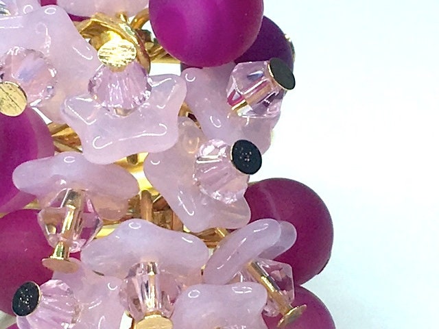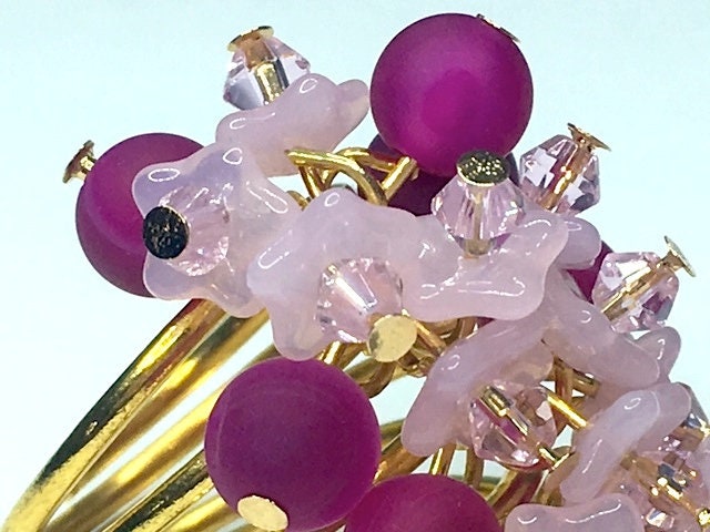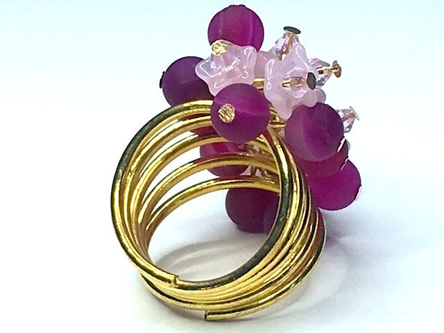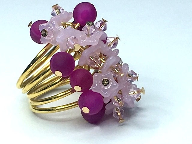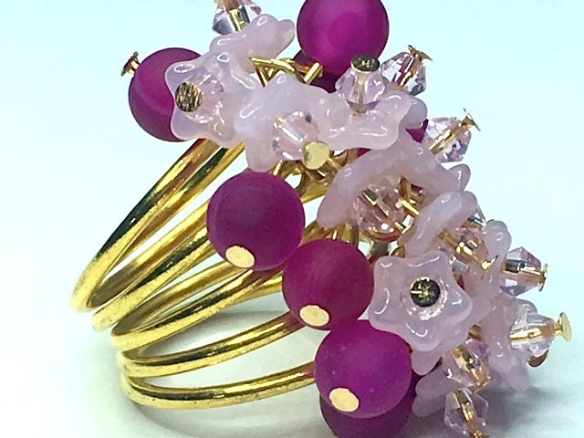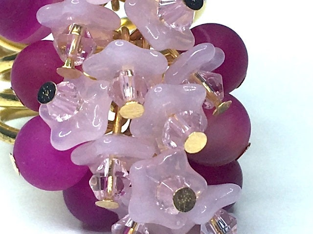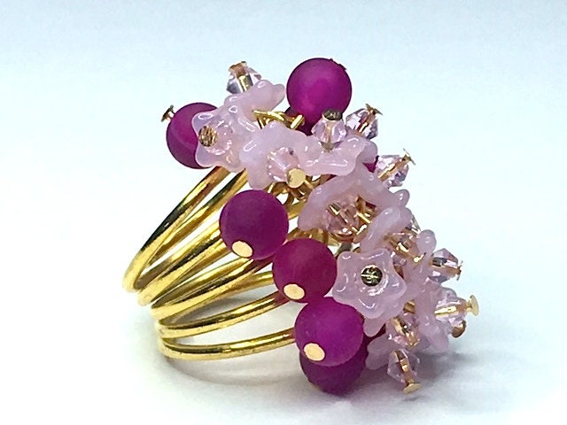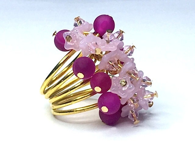 This is some ring. A beautiful statement piece in magenta onyx, to which I've added pink Czech glass flowers topped with Swarovski crystals.
