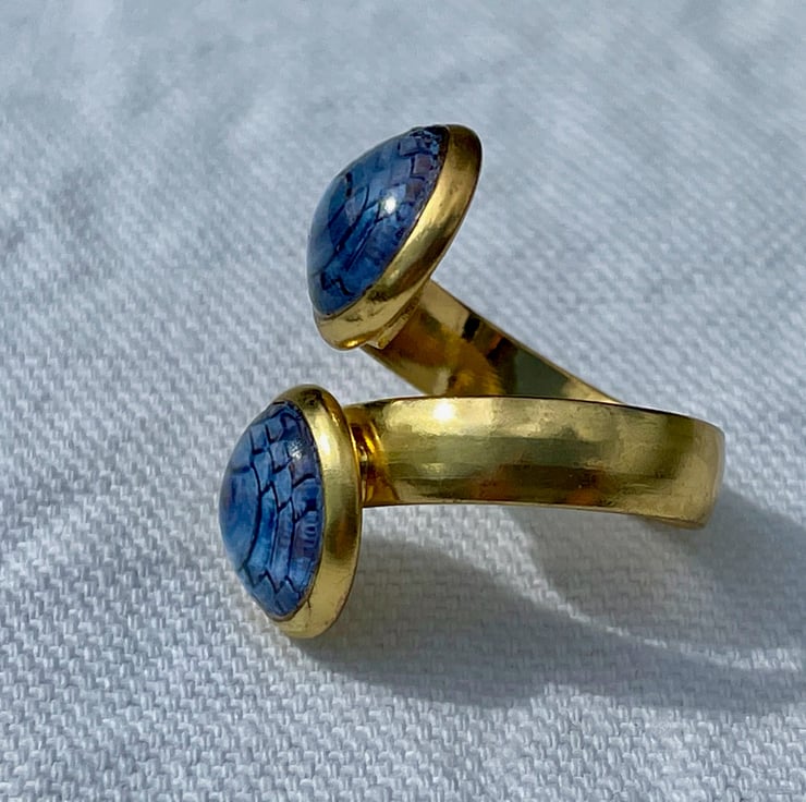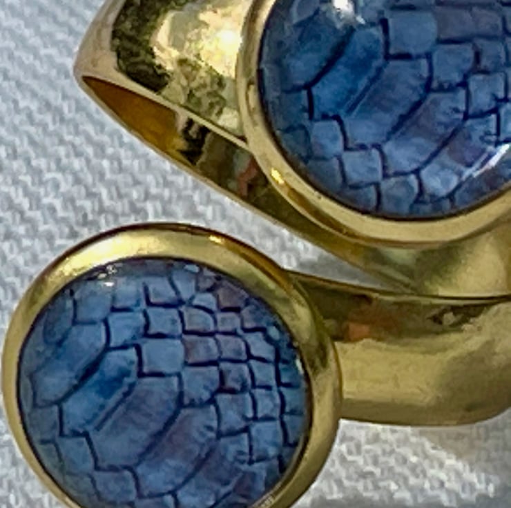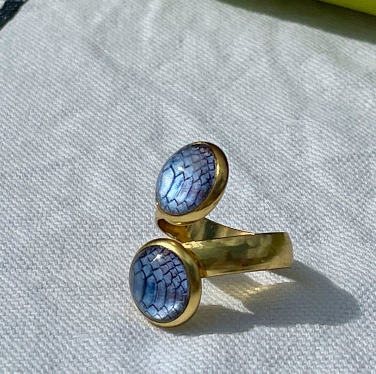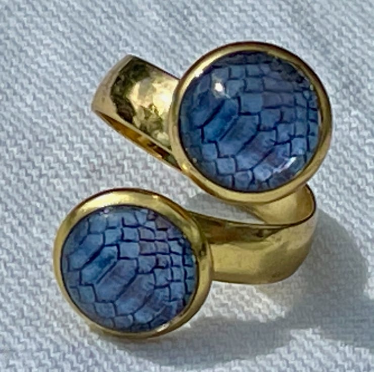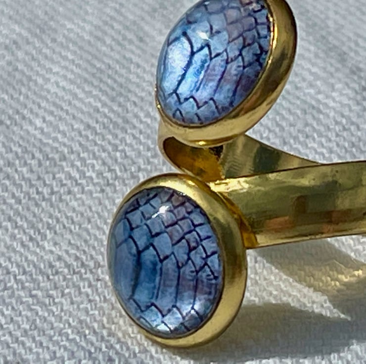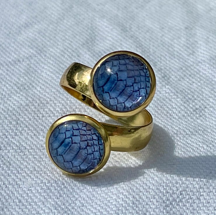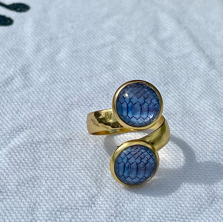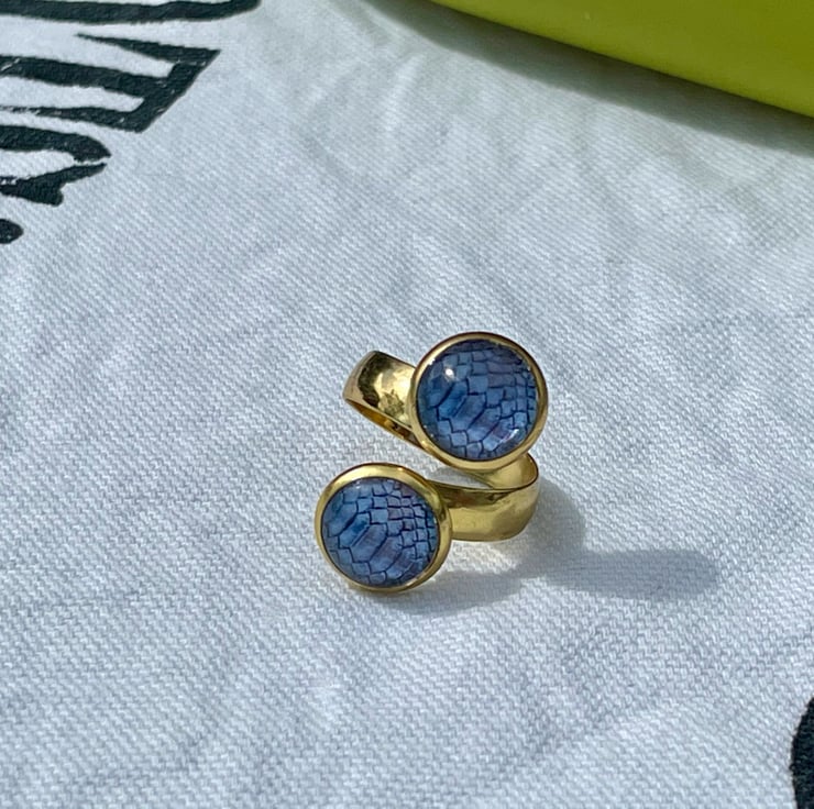 The cabochons are 10mm and in a shade of blue snakeskin (we know!),The ring is adjustable. Fits all sizes.