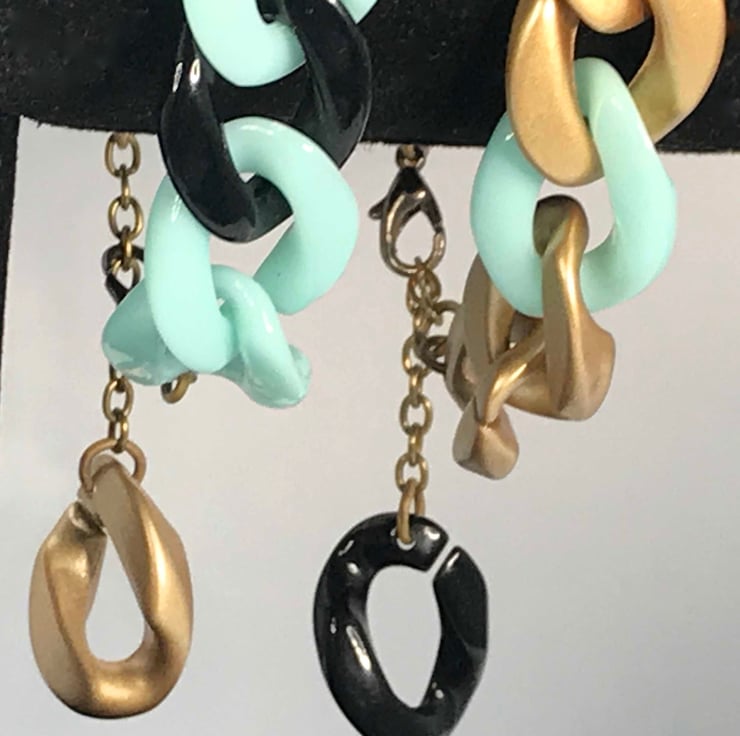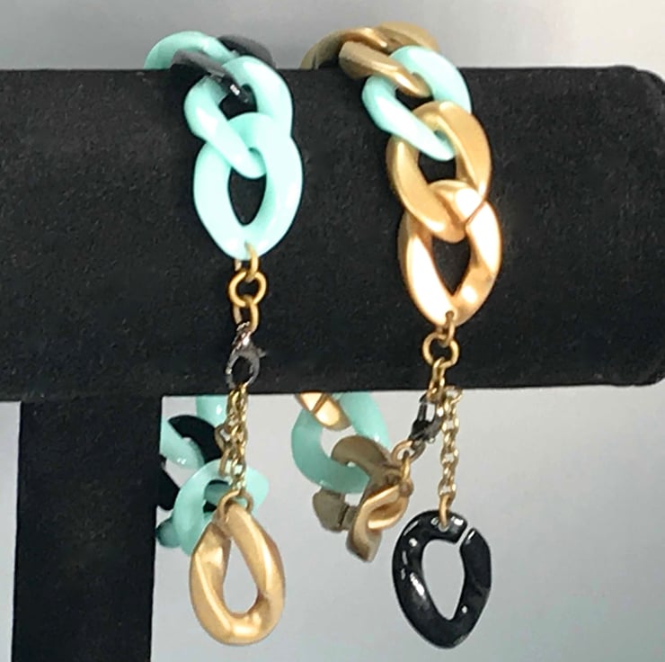 Bang on trend yet retro these are chunky acrylic adjustable bronze based bracelets. I have them in several colours all based on gold mint and black. I've finished them off with bronze findings to make the mint really pop.