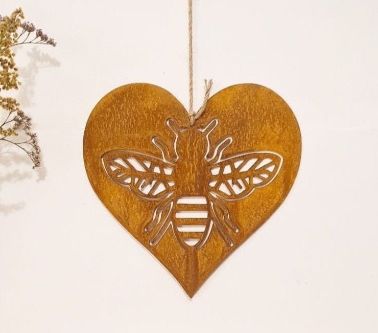 Our Rusted Metal Heart with bee is cut from a 2mm mild steel. Each item is then hand rusted giving the piece its very own unique finish. The rustic finish will maintain its beauty for you to enjoy year after year.