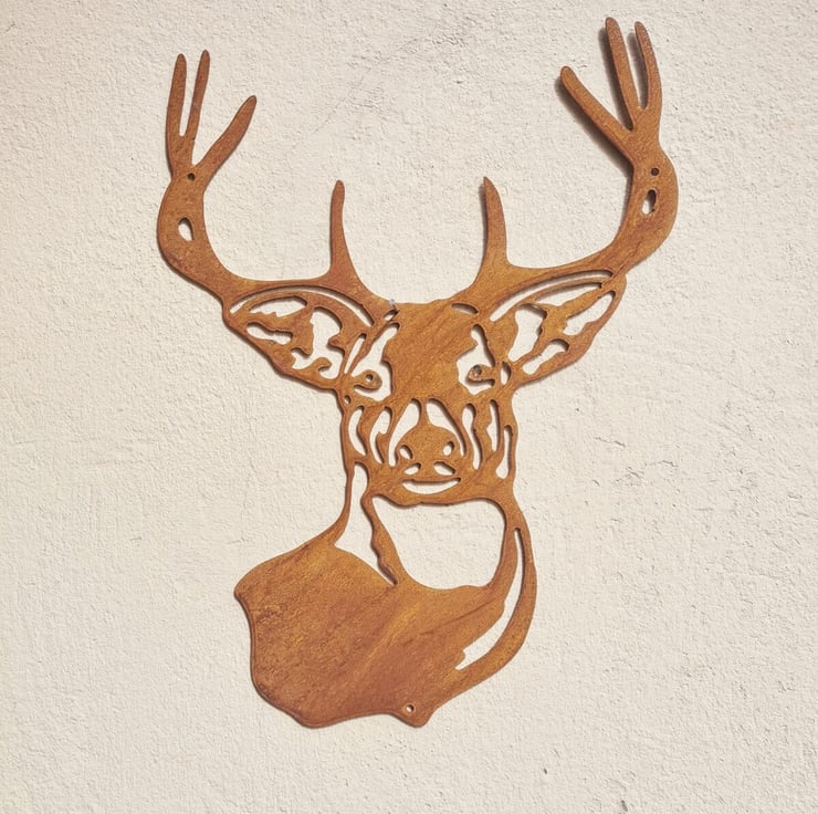 Our Rusted Metal Stags Head is cut from a 2mm mild steel. Each item is then hand rusted giving the piece its very own unique finish. The rustic finish will maintain its beauty for you to enjoy year after year.