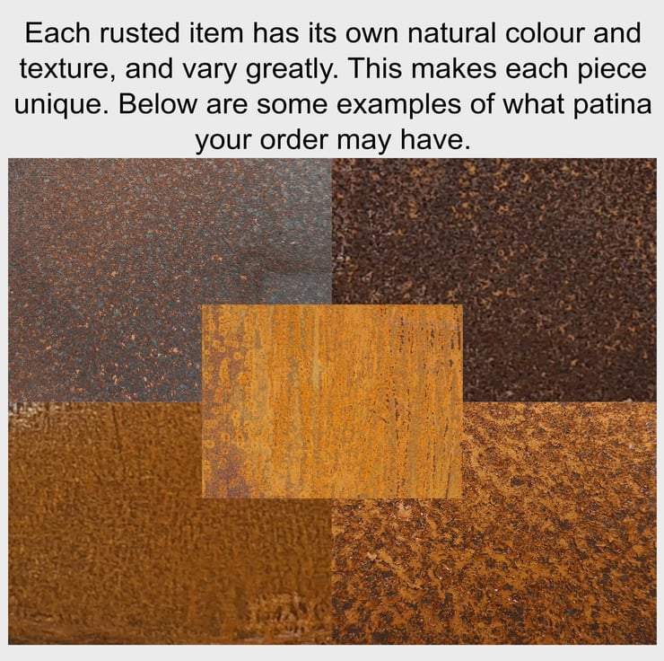 The Rusted finish comes in many different shades and may not look exactly like the image, however; this makes each item unique. We recommend that items are spaced slightly from surfaces too prevent any sort of marking. Please be aware that the rusting process will develop over time to meet its full beauty, resulting in a natural change of colour appearance.