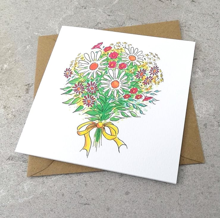 This ecofriendly Mother's Day card Flower Bouquet has been printed using my original artwork on to 100% recycled felted white 270g card and has been left blank inside for your own special message. This eco friendly felted white card has a lovely textured finish. Size 140 x 140 mm