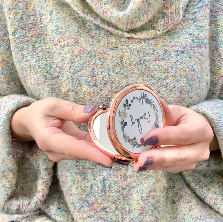 This rose gold pocket mirror features a wildflower wreath design in pretty muted colours and is personalised with the name of your choice.