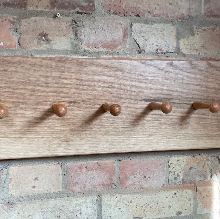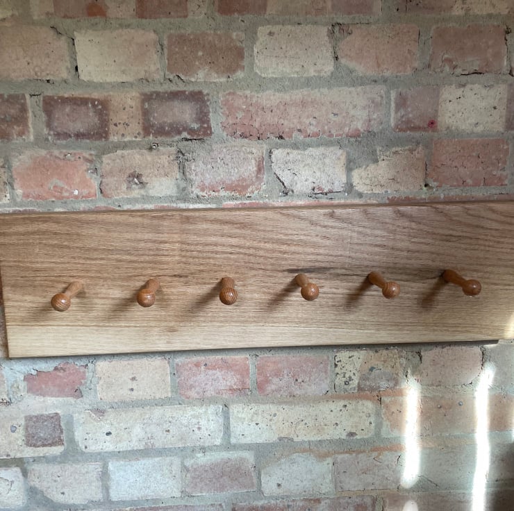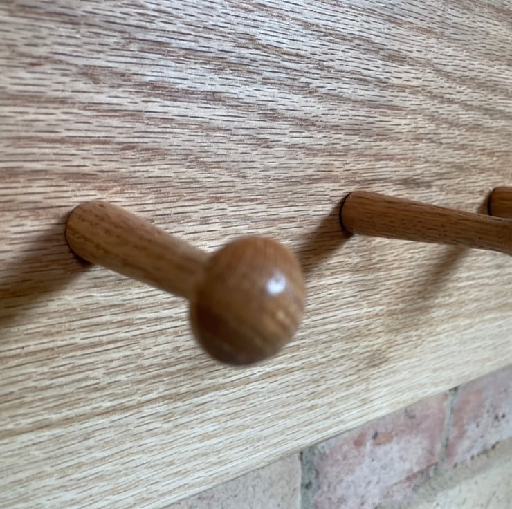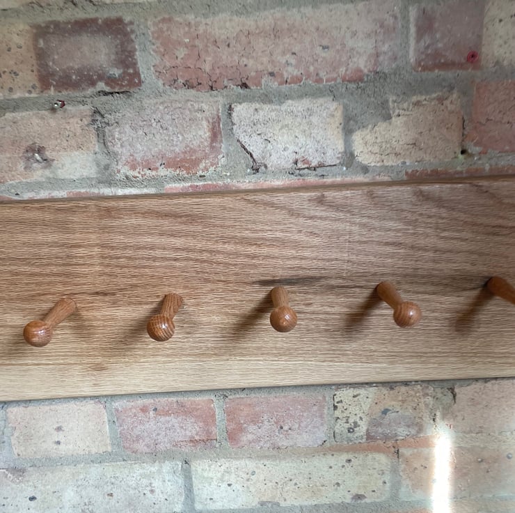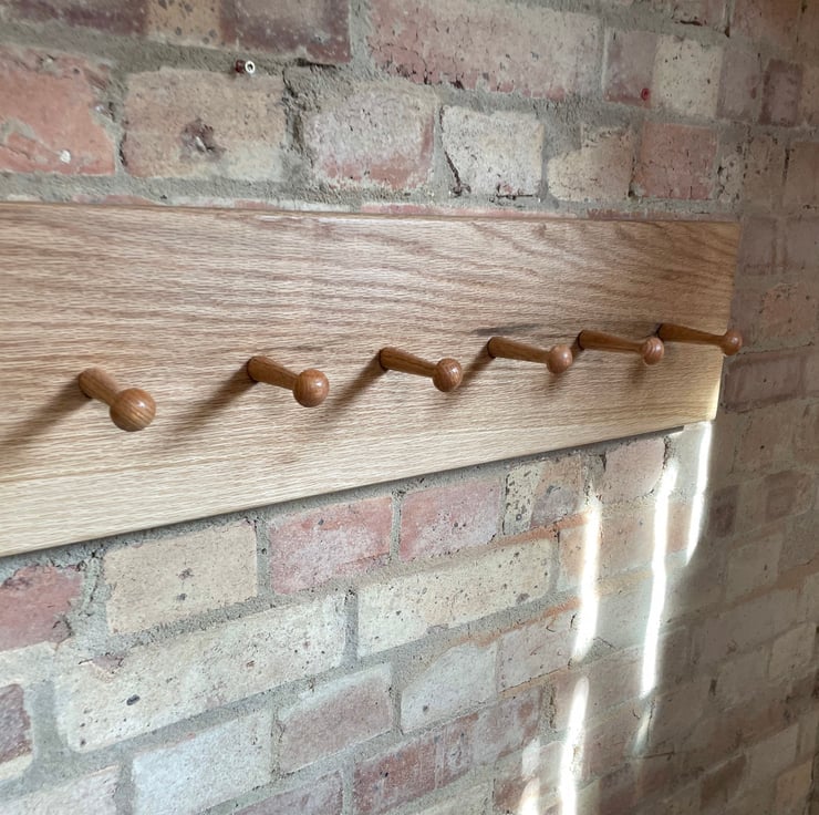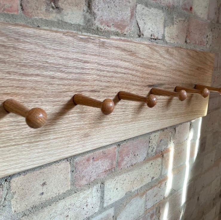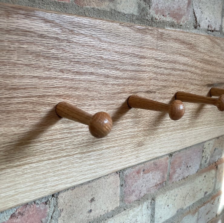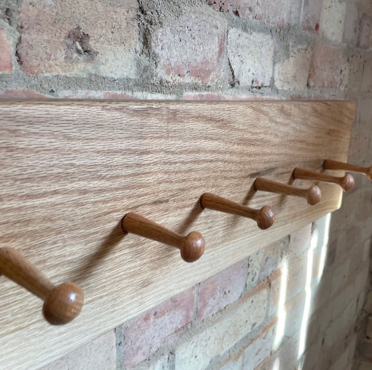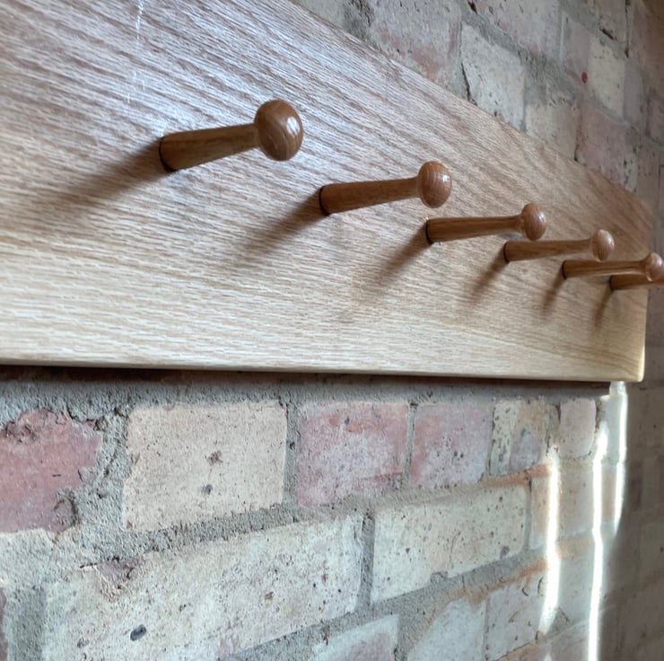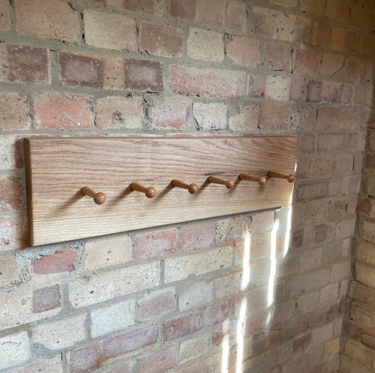 Shaker style coat rack made from solid oak, neat and minimalist. Hand finished in an osmo oil that allows the natural raw look and exposes the grain of the timber, it also protects it from yellowing with exposure to light and uv rays.