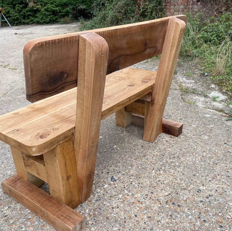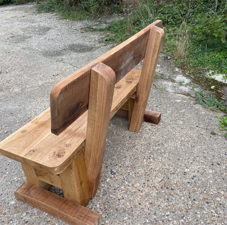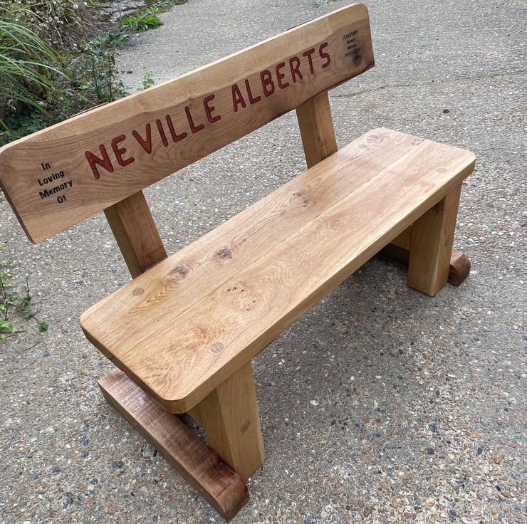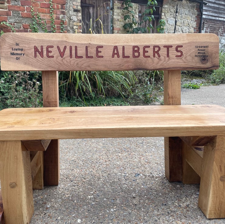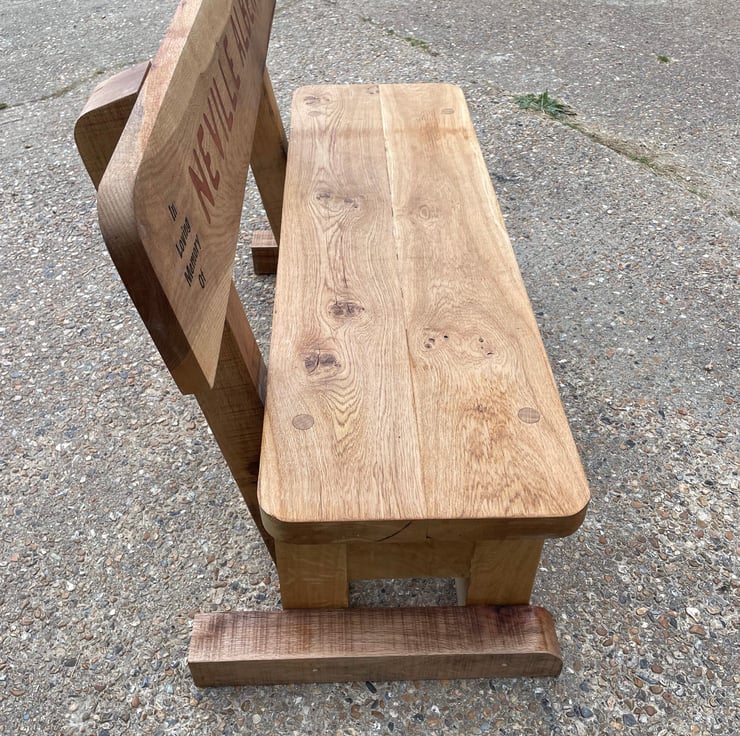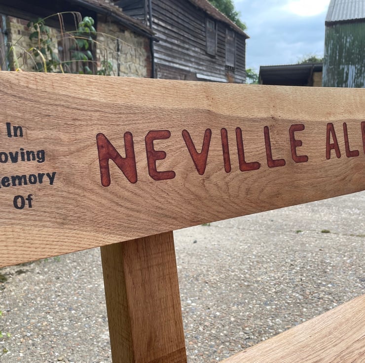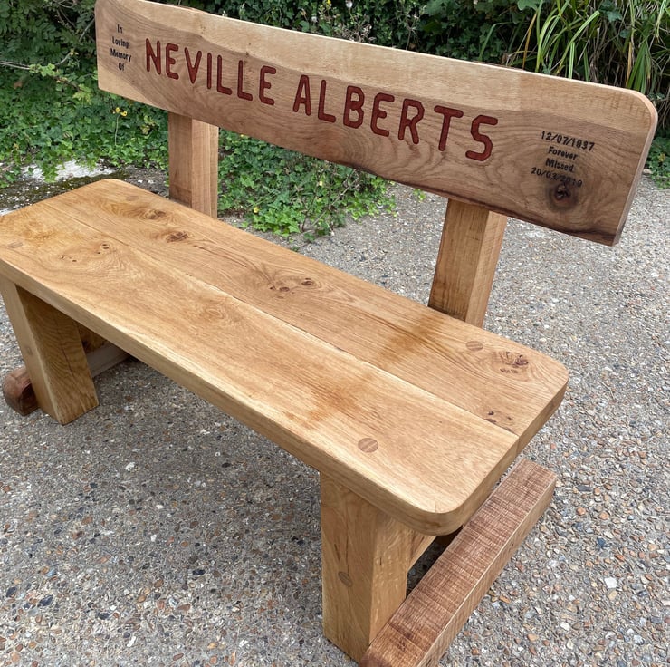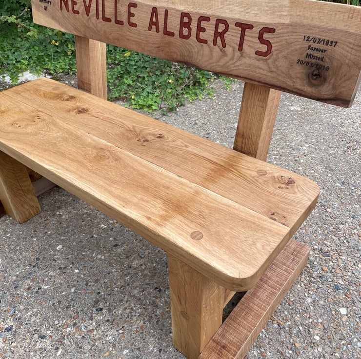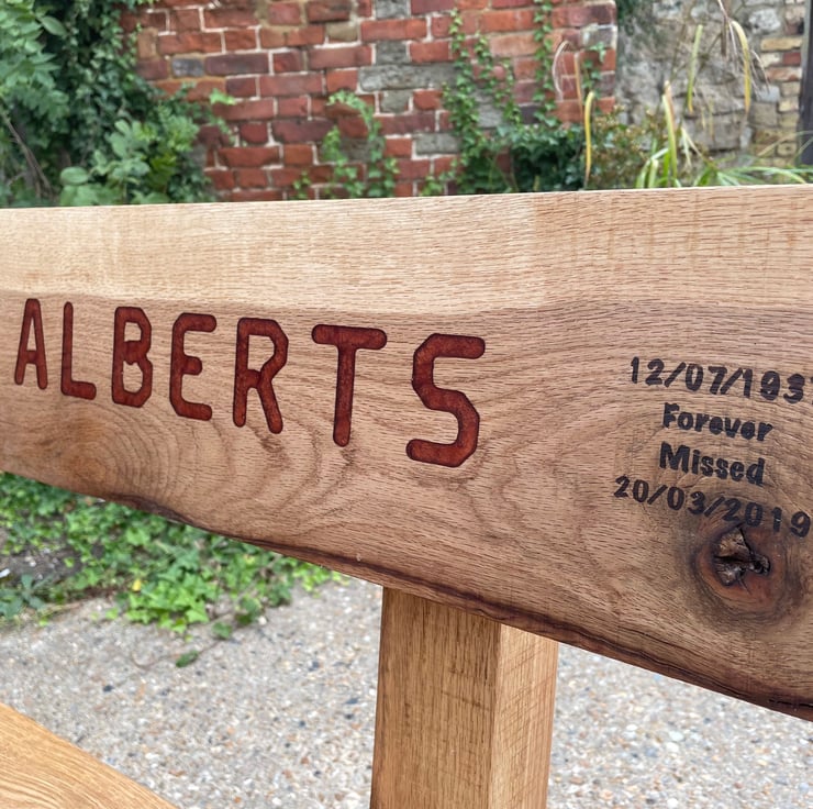Bench is finished in a osmo uv oil. Name engraved in backrest filled with a coloured resin, in loving memory and dates are laser engraved on either side of the name.