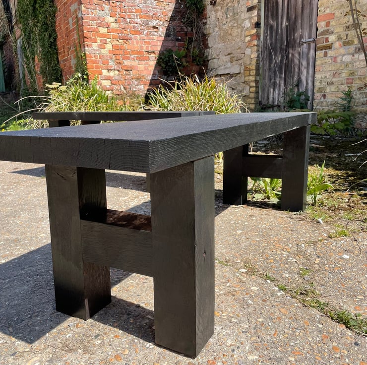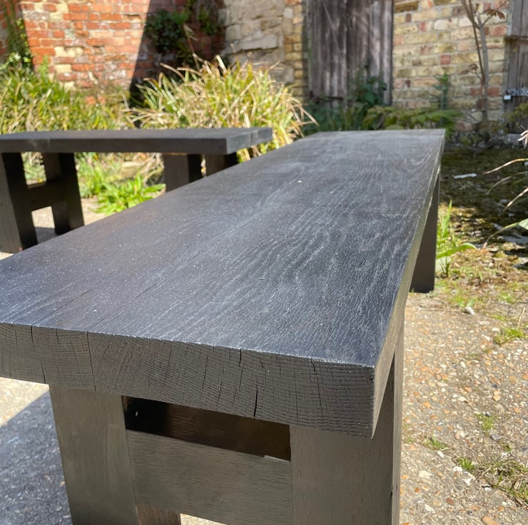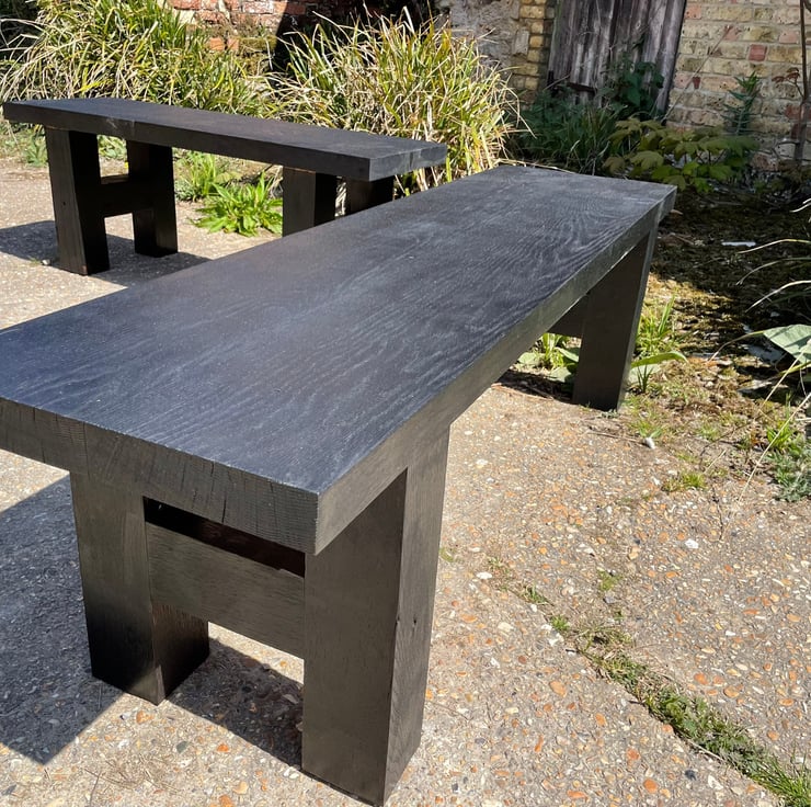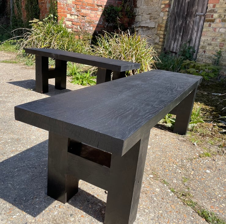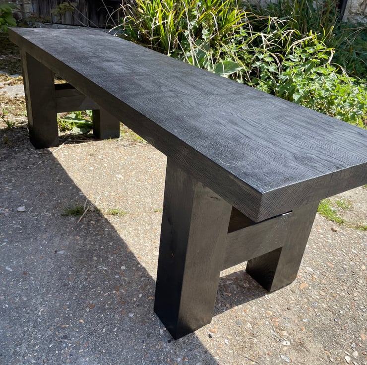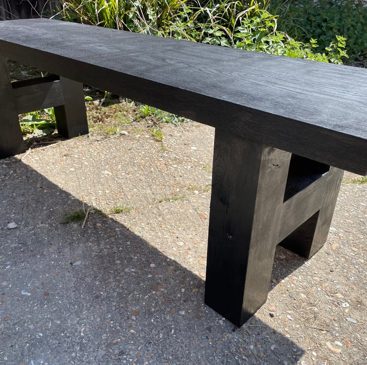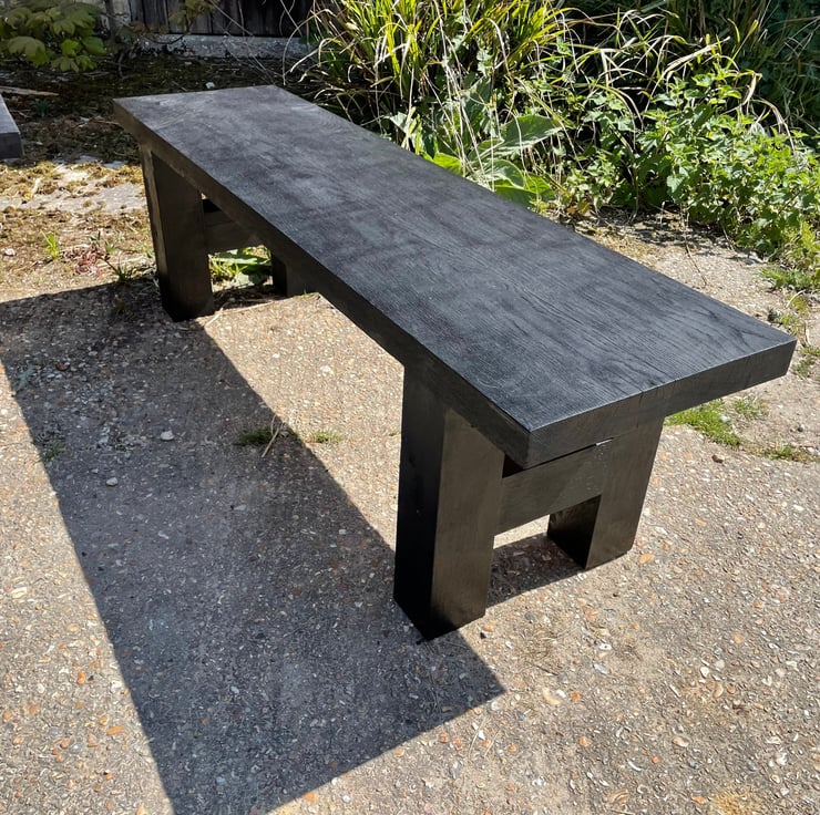 Outdoor oak bench finished in a charred finish (burnt wood) and osmo uv oil