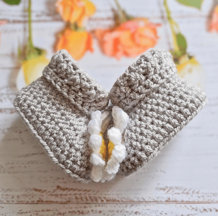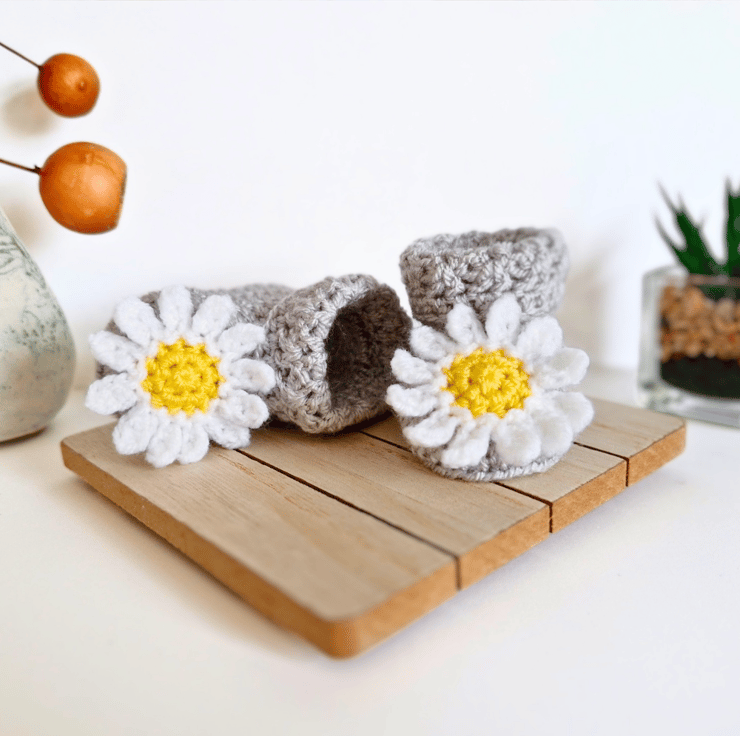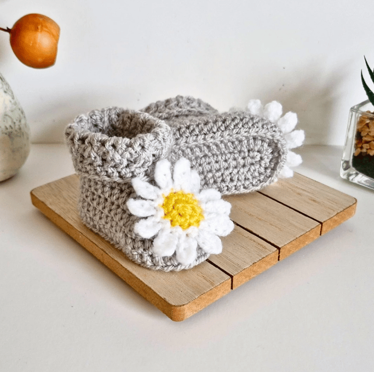 Crochet Baby Booties with Daisy – Silver, Newborn to 6 Months