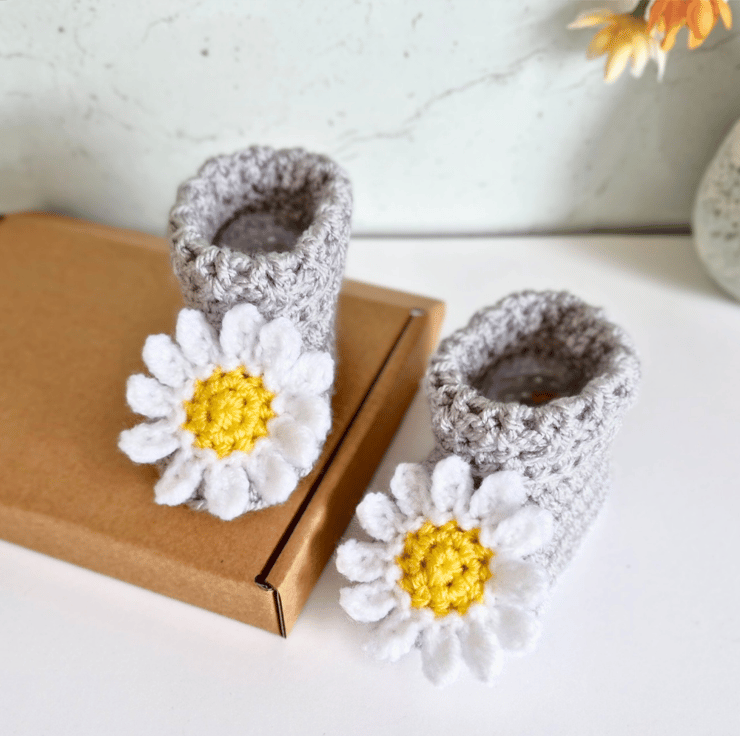Handmade Crochet Daisy Baby Booties – Made to Order in Various Colours (Newborn to 6 Months)