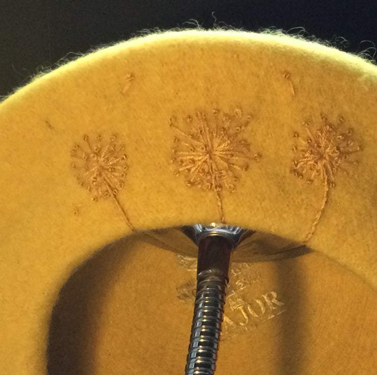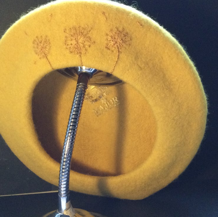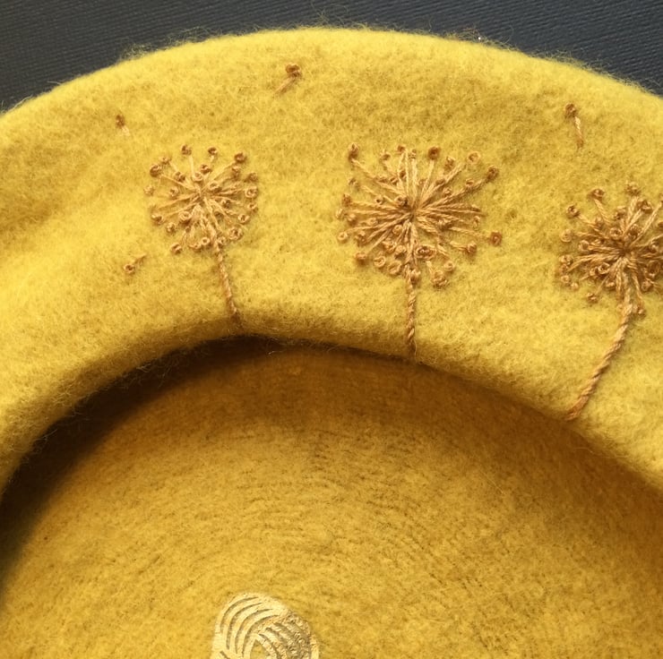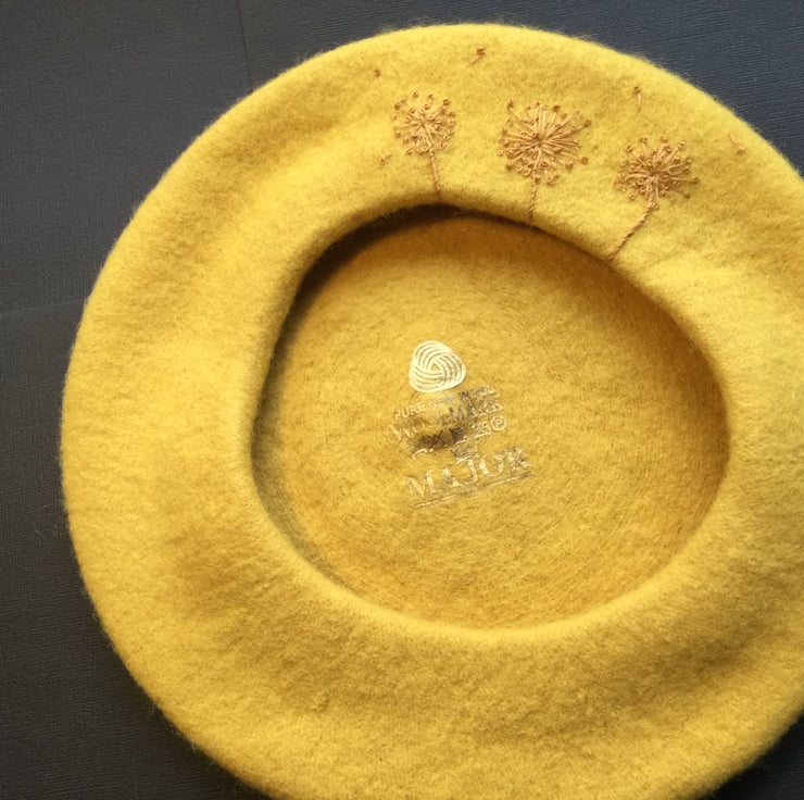 The embroidery sits on the rim of Beret and it can be worn in the middle or jauntily to the left or right when placed on the head. The embroidery is done in good quality cottons ina golden yellow shade and is a set of three dandelion “clocks” in a row with a few flying off in the breeze. You can try blowing on them and making a wish but the “clocks” will still be there ready to make another wish if you need it.
