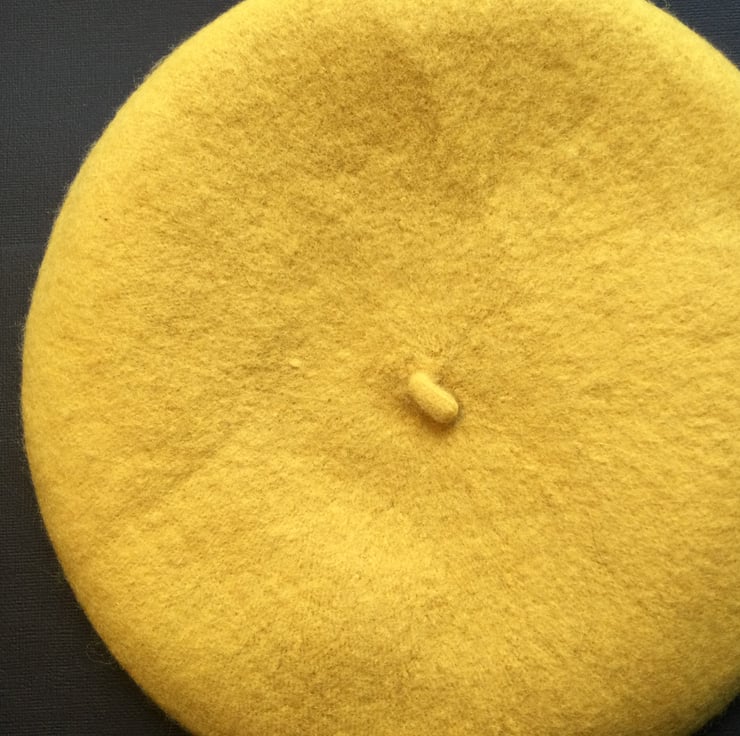This Beret is 100% pure new and measures 27cm x 27cm round. It is a lovely mellow yellow and is a nice heavyweight. This makes it a cosy warm hat and has enough natural stretch to cover ears if needed to keep them nice and warm this winter.