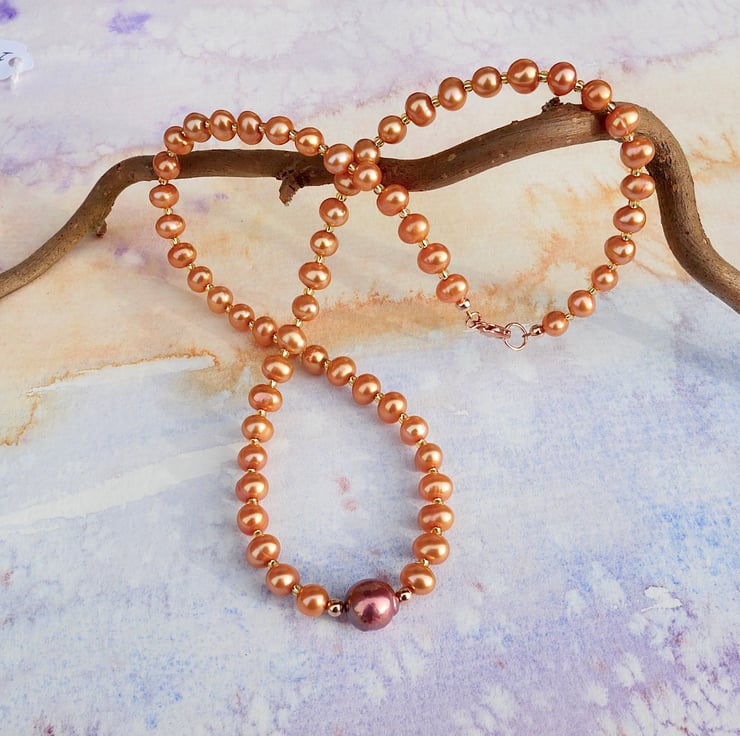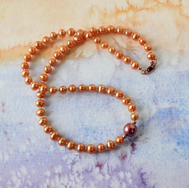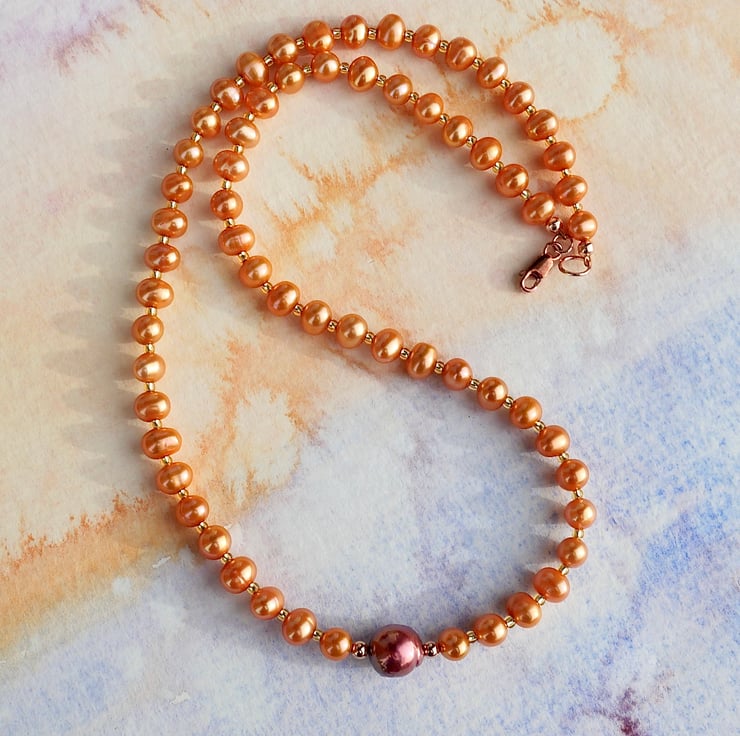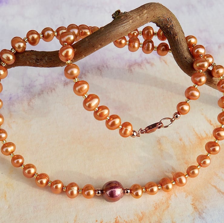 A pretty pearl necklace made from nearly round freshwater pearls in a vibrant orange with one central large baroque pearl in berry red, and gold glass seed beads. The 9 mm trigger clasp is rose gold filled. The total length of the necklace is 44 cms.