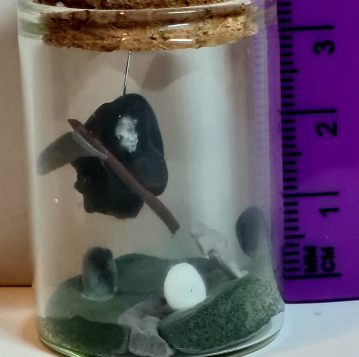 Tiny grim reaper (1cm) carrying his trusty scythe, hand crafted using air dry clay, floating around in his favourite tiny graveyard, contained a weeny glass bottle with cork. The gravestones are around 6mm high. Postage is included in the cost. NOT SUITABLR FOR CHILDREN DUE TO TINY PARTS AND GLASS BOTTLE