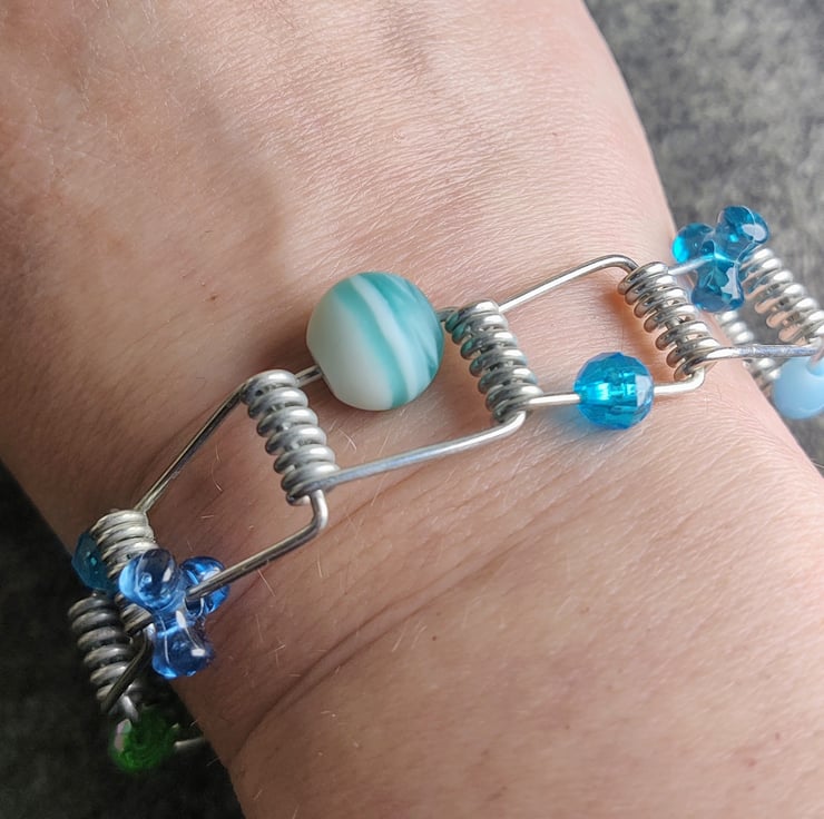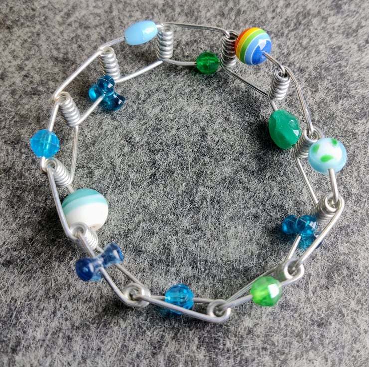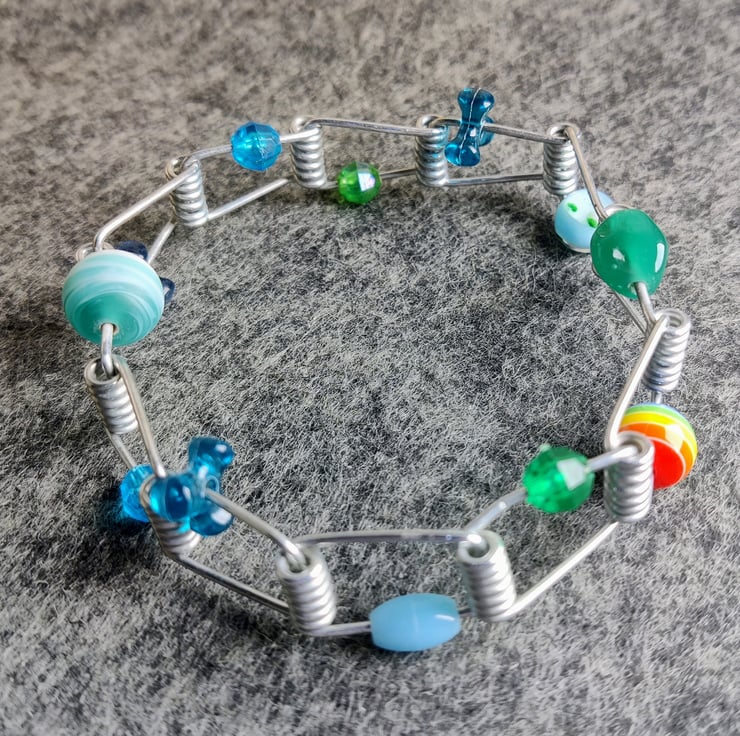 Interlocking Metal Coil Springs with coloured beads creating an unusual and unique flexible bracelet.