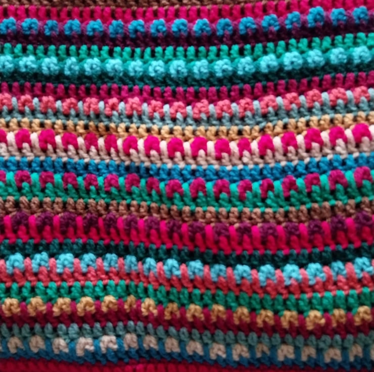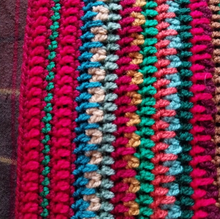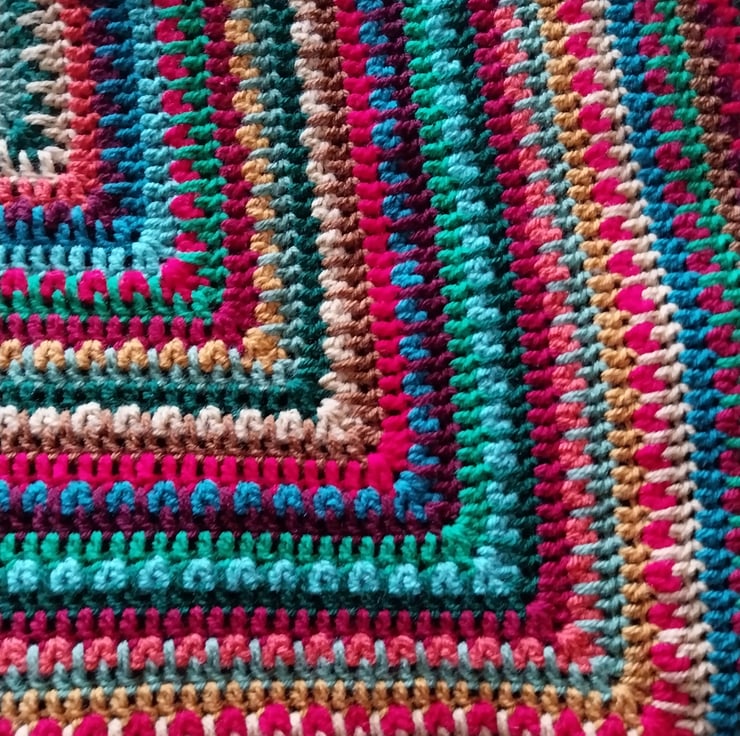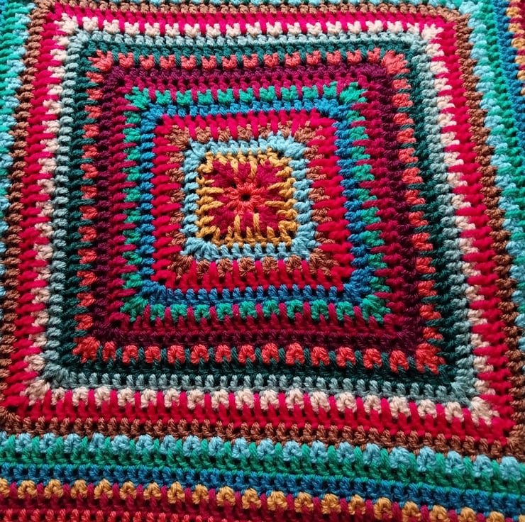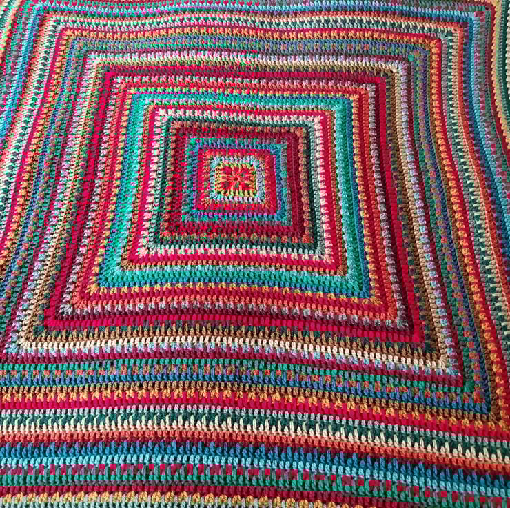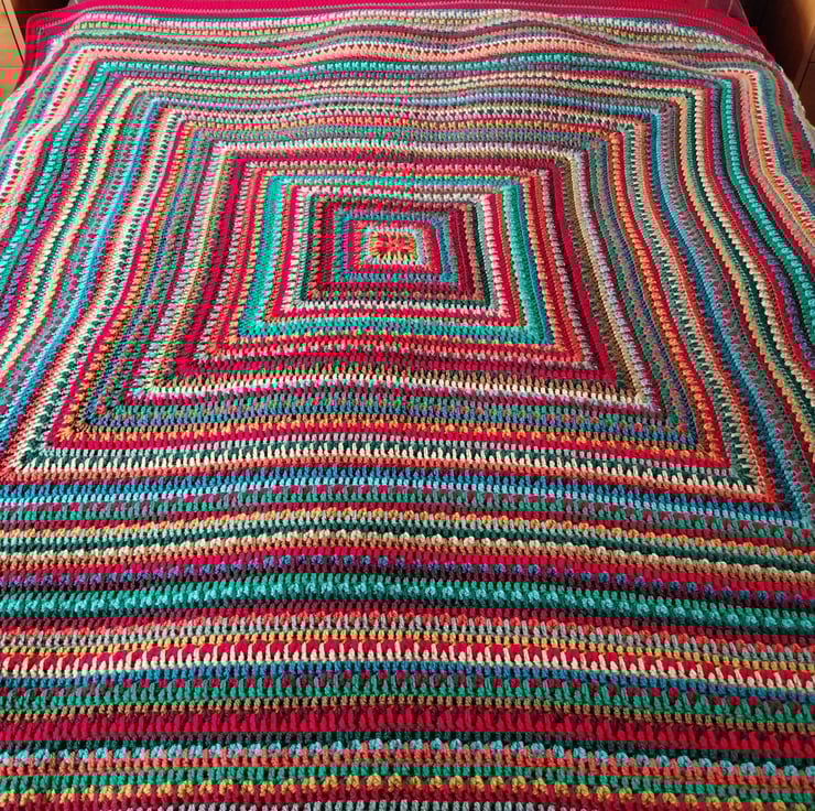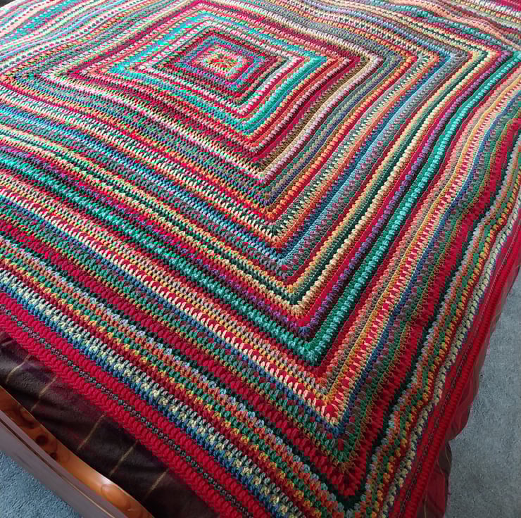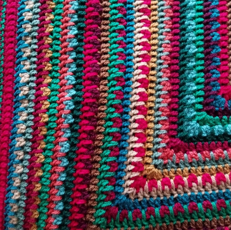 This cheerful blanket has been crocheted in a good quality acrylic yarn and is machine washable at 30°