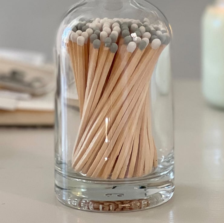 Luxury Long Matches in a bottle. Each match is 10cm long, perfect for lighting Candles the BBQ/Fire Pit or to display next to your fireplace! Over 100 long matches in a stylish glass bottle with a wooden stopper and strike pad on the base of the bottle.